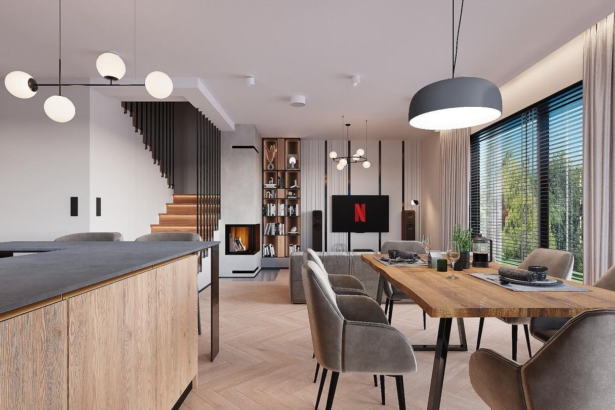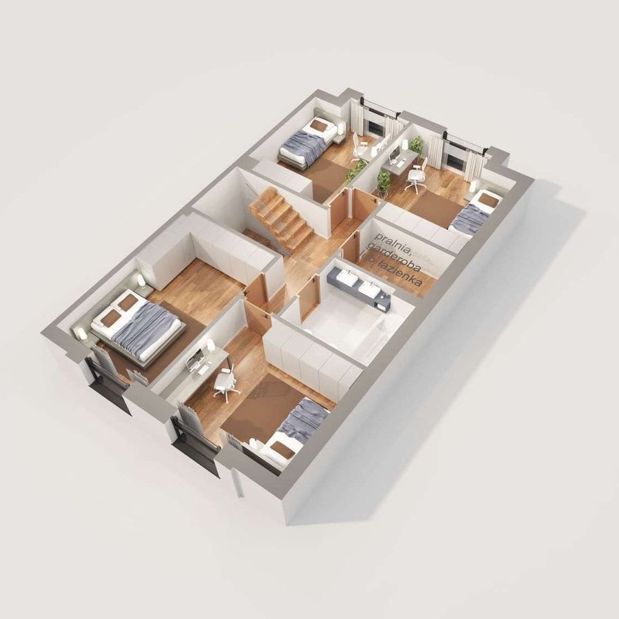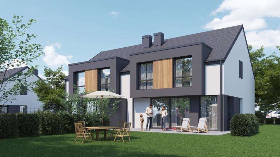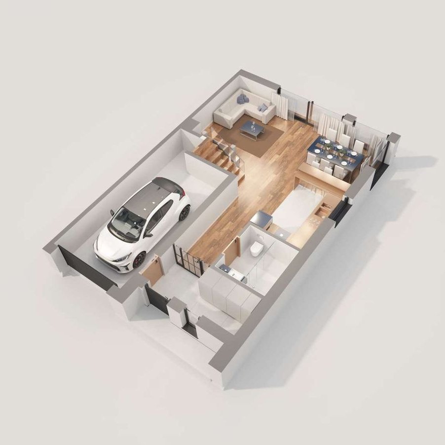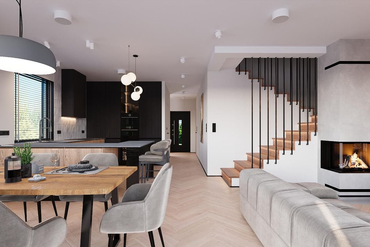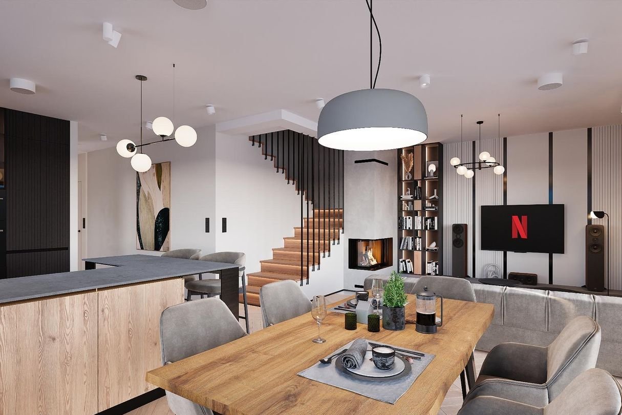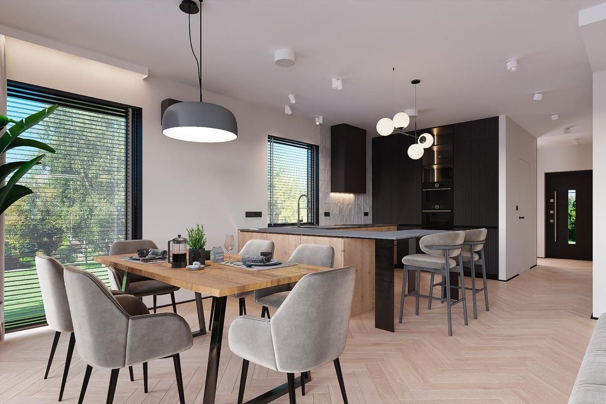 Prostą bryłę domu z dwuspadowym dachem urozmaicają nowoczesne, prostokątne lukarny. Charakter domu podkreśla również elewacja z dużymi przeszkleniami, wykończona białym i grafitowym tynkiem, z elementami drewnianej okładziny, gustownie zakomponowana z grafitową stolarką i łączoną płaską dachówką w kolorze antracytowym. W segmencie znajduje się jednostanowiskowy garaż, w całości wpisany w bryłę budynku, z wjazdem zaprojektowanym obok strefy wejściowej. Frontowy podcień w funkcjonalny sposób osłania wejście, a pionowe przeszklenie zaprojektowane tuż przy drzwiach wejściowych zapewnia naturalne światło w wiatrołapie lub kotłowni. Przez wiatrołap i hol, z miejscami na wbudowanie szaf do przechowywania, wchodzimy do dobrze doświetlonej przestronnej strefy dziennej, w której komfortowe warunki do rodzinnego wypoczynku oferuje salon z kominkiem, a jadalnia z dużym stołem przy oknie zaprasza na wspólne posiłki. Salon doświetla szerokie okno przesuwne, które łączy go z tarasem i ogrodem. Strefa prywatna na poddaszu, dzięki wysokiej ściance kolankowej oferuje wygodne pomieszczenia, doskonale doświetlone za pomocą wysokich przeszkleń. Na piętrze istnieje duża możliwość konfiguracji i funkcji poszczególnych pomieszczeń np. 3 pokoje z prywatna garderobą i łazienką rodziców lub klasycznie 4 sypialnie ze wspólną dużą łazienką oraz osobną pralnią lub garderobą.