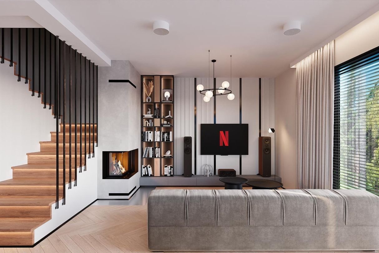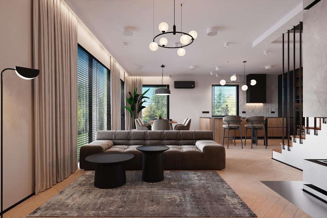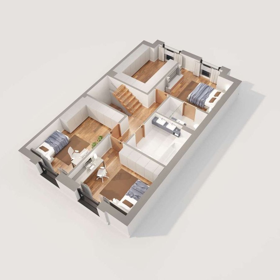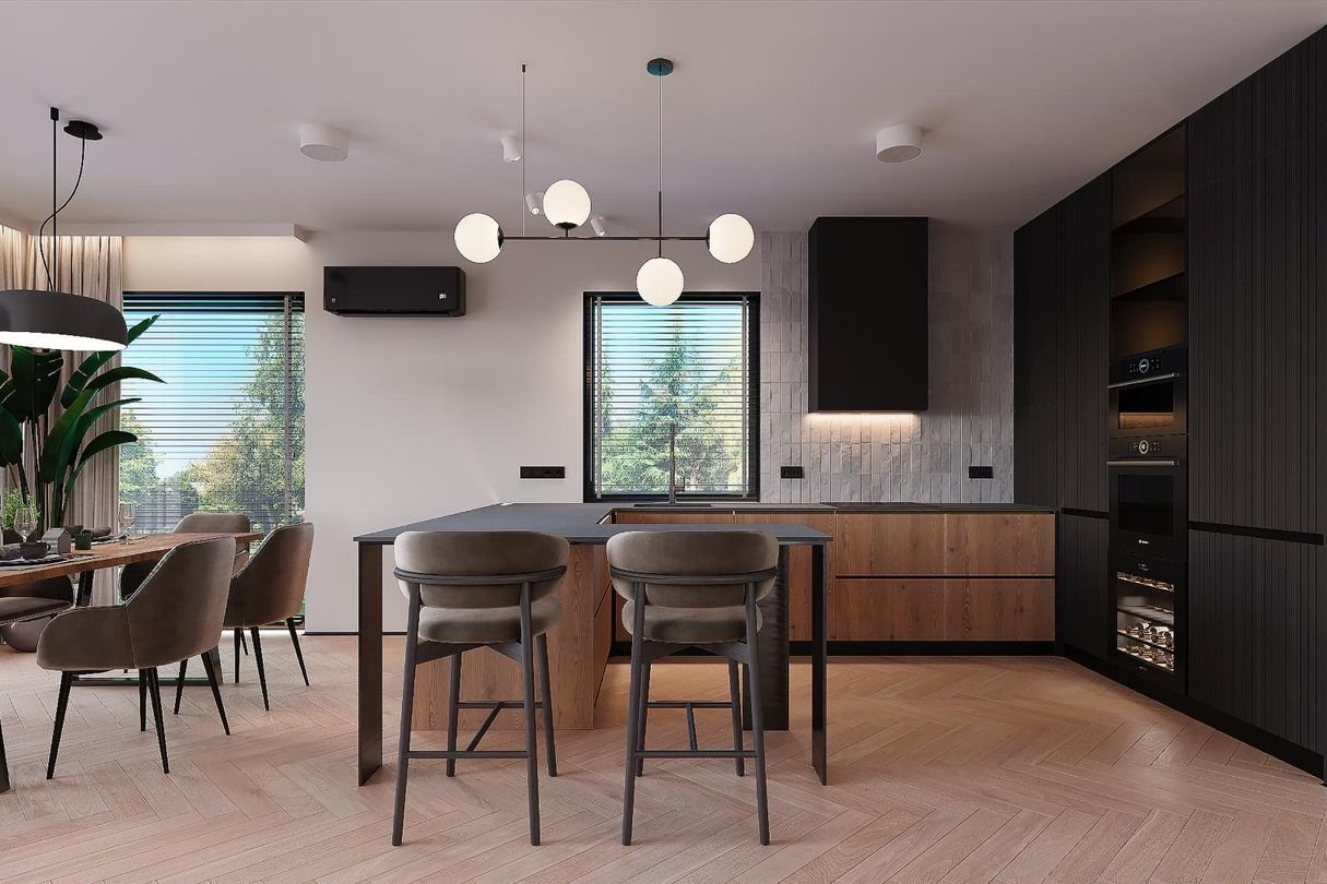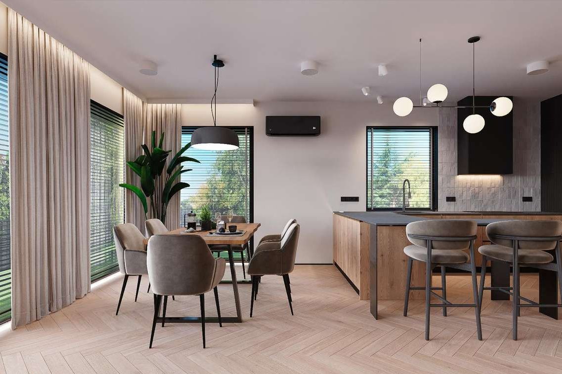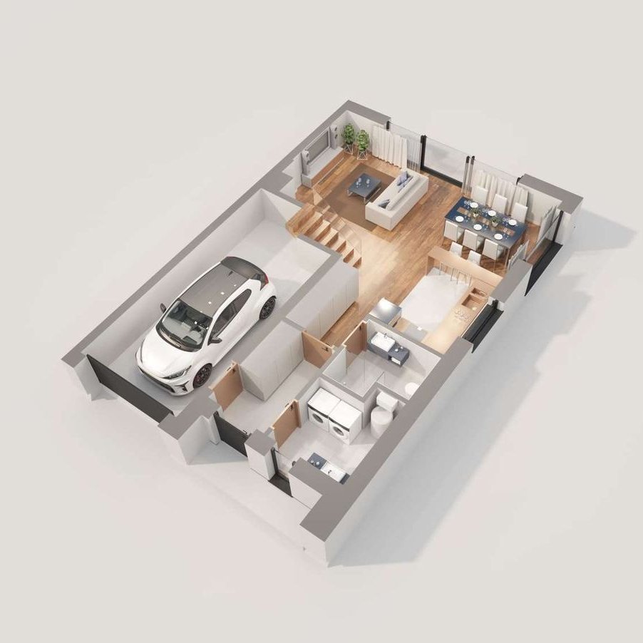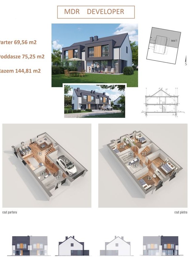Prostą bryłę domu z dwuspadowym dachem urozmaicają nowoczesne, prostokątne lukarny. Charakter domu podkreśla również elewacja z dużymi przeszkleniami, wykończona białym i grafitowym tynkiem, z elementami drewnianej okładziny, gustownie zakomponowana z grafitową stolarką i łączoną płaską dachówką w kolorze antracytowym. W segmencie znajduje się jednostanowiskowy garaż, w całości wpisany w bryłę budynku, z wjazdem zaprojektowanym obok strefy wejściowej. Frontowy podcień w funkcjonalny sposób osłania wejście, a pionowe przeszklenie zaprojektowane tuż przy drzwiach wejściowych zapewnia naturalne światło w wiatrołapie lub kotłowni. Przez wiatrołap i hol, z miejscami na wbudowanie szaf do przechowywania, wchodzimy do dobrze doświetlonej przestronnej strefy dziennej, w której komfortowe warunki do rodzinnego wypoczynku oferuje salon z kominkiem, a jadalnia z dużym stołem przy oknie zaprasza na wspólne posiłki. Salon doświetla szerokie okno przesuwne, które łączy go z tarasem i ogrodem. Strefa prywatna na poddaszu, dzięki wysokiej ściance kolankowej oferuje wygodne pomieszczenia, doskonale doświetlone za pomocą wysokich przeszkleń. Na piętrze istnieje duża możliwość konfiguracji i funkcji poszczególnych pomieszczeń np. 3 pokoje z prywatna garderobą i łazienką rodziców lub klasycznie 4 sypialnie ze wspólną dużą łazienką oraz osobną pralnią lub garderobą.