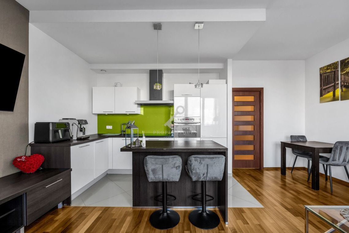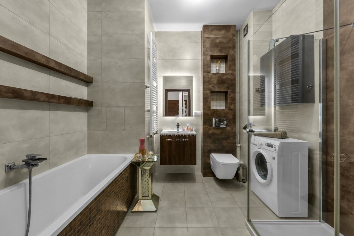 2 pokojowe mieszkanie z bardzo korzystnym układem, gotowe do wprowadzenia/odświeżenia. Składa się z przedpokoju, dużej łazienki (wyposażonej w wannę, prysznic oraz pralkę), salonu (wyposażony w klimatyzację oraz telewizor) z aneksem kuchennym (wyposażony w piekarnik, zmywarkę, płytę indykcyjną, lodówkę), z sypialni oraz dodatkowo garderoby. W całym mieszkaniu położony został drewniany parkiet oraz gustowny gres. Mieszkanie sprzedawane z całym wyposażeniem. Duży balkon o powierzchni około 4 m2 oraz miejsce w garażu podziemnym to niewątpliwe zalety tego mieszkania.