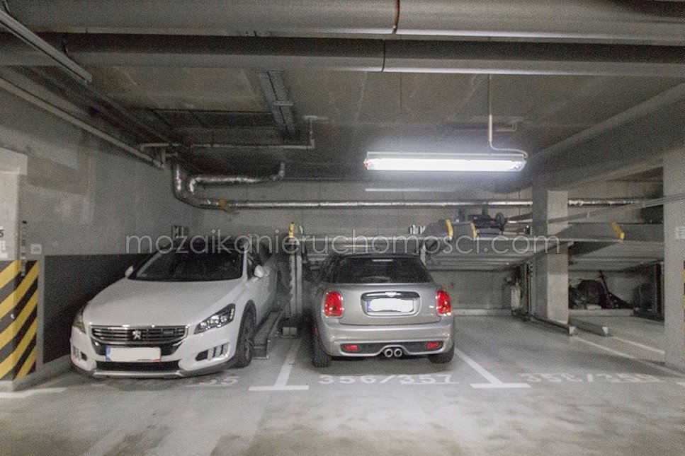 Cena miejsca postojowego wynosi 75 000,- złotych - jest to miejsce w garażu podziemnym z platformą parkingową, na której można zaparkować dwa samochody.