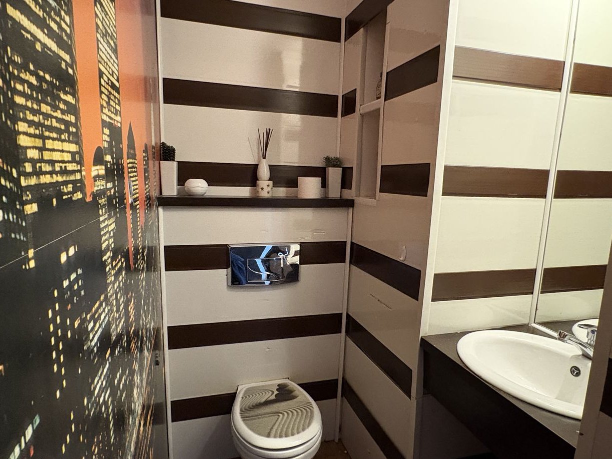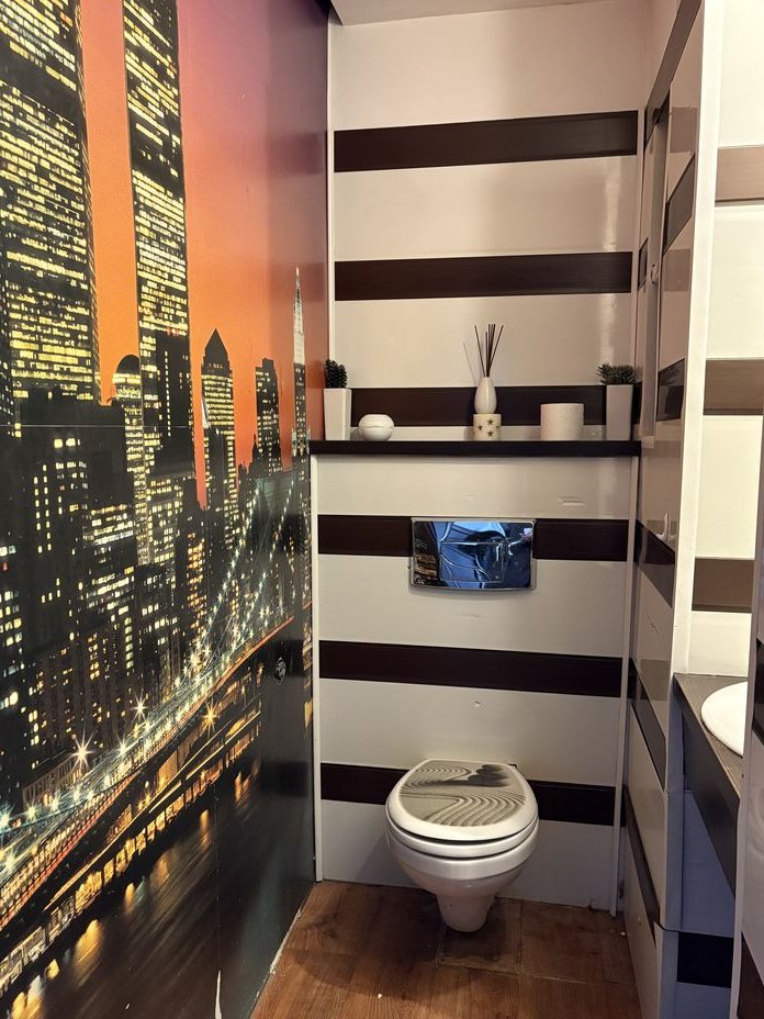 - wc: ściany panel i tapeta, podłoga parkiet