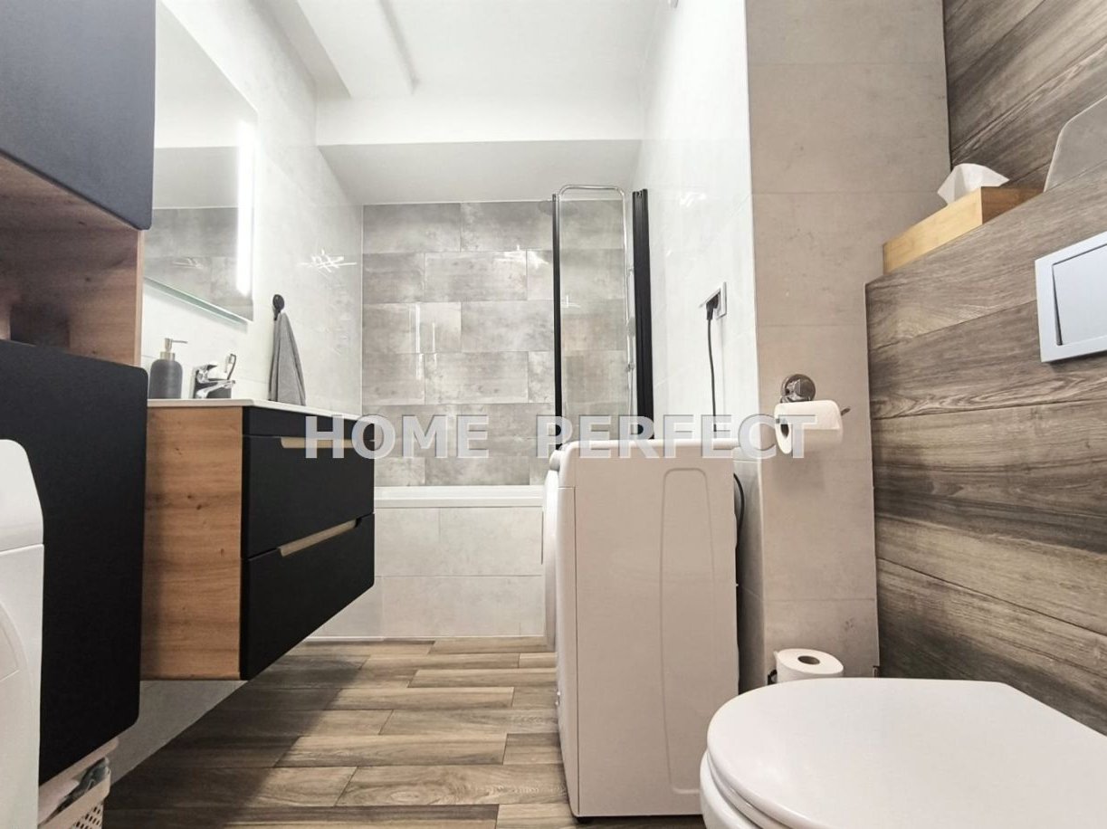 W skład mieszkania wchodzi salon z aneksem kuchennym, sypialnia, łazienka z WC oraz przedpokój. Dodatkową powierzchnię stanowi duży, bo aż dziewięciometrowy balkon. Mieszkanie wykończone kilka lat temu. Odświeżone w ubiegłym roku. Na ścianach gładzie, na podłodze w pokojach panele AC5 8 mm; w łazience terakota, w przedpokoju gres. Na wyposażeniu łazienki podwieszane WC, wanna z funkcją prysznica, umywalka z lustrem, szafki oraz pralka. W całym mieszkaniu zainstalowane oświetlenie ledowe. Okna PCV, trzyszybowe, sześciokomorowe - ekspozycja zachodnia. Ponadto w mieszkaniu zamontowana klimatyzacja "AUX", która nie tylko świetnie sprawdzi się w upalne dni ale posiada też funkcję dogrzewania. Kuchnia wyposażona dodatkowo w zestaw filtrujący do wody z odwróconą osmozą. W mieszkaniu pozostają wszystkie meble w zabudowie oraz dobrej jakości sprzęt AGD (lodówka "Samsung", płyta indukcyjna "Samsung", piekarnik elektryczny "Bosch", zmywarka "Whirlpool, okap i zlewozmywak z baterią). Pozostałe wyposażenie do uzgodnienia. W przedpokoju obszerna szafa w zabudowie.