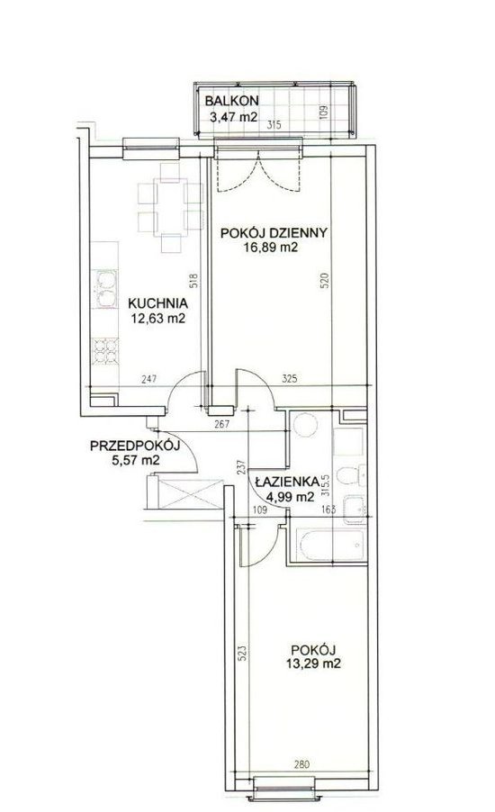 Mieszkanie składa się z: przedpokoju, oddzielnej kuchni, salonu, sypialni, łazienki i balkonu.