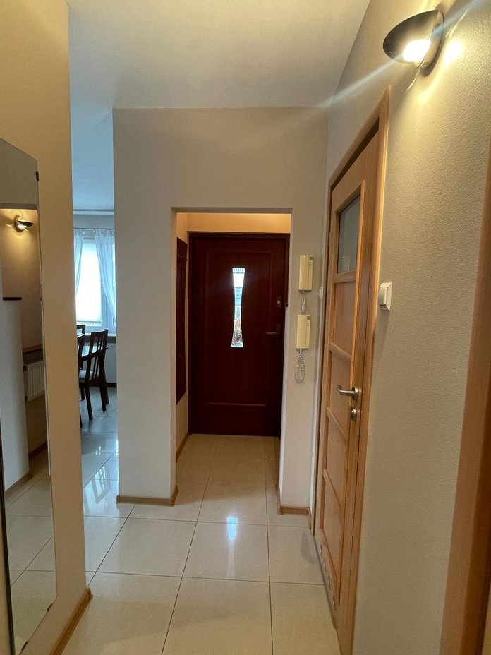 Mieszkanie 2-pokojowe, słoneczne z dwoma balkonami (północ i południe), przestronna kuchnia z jadalnią z pełnym umeblowaniem (meble, stół z krzesłami, lodówka, zmywarka, płyta gazowa i piekarnik). Osobno łazienka i WC. Mieszkanie posiada miejsce na garderobę. W cenę czynszu wchodzi: ciepła i zimna woda użytkowa miejska, c.o. miejskie, opłata za odpady, fundusz remontowy. Budynek po pełnej termomodernizacji. Mieszkanie posiada możliwość podziału kuchni i jadalni na dwa osobne pomieszczenia z oknami.