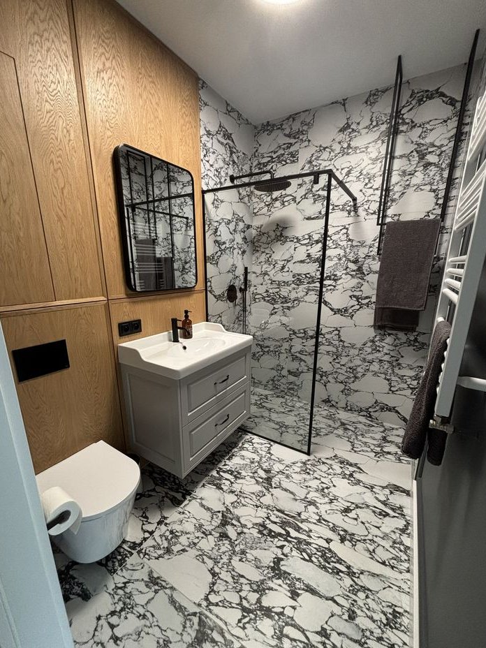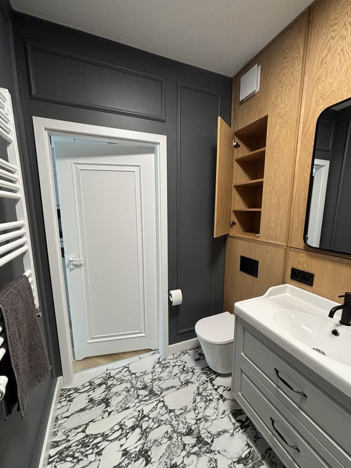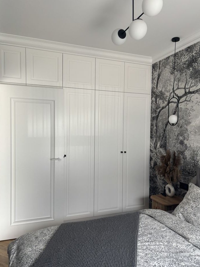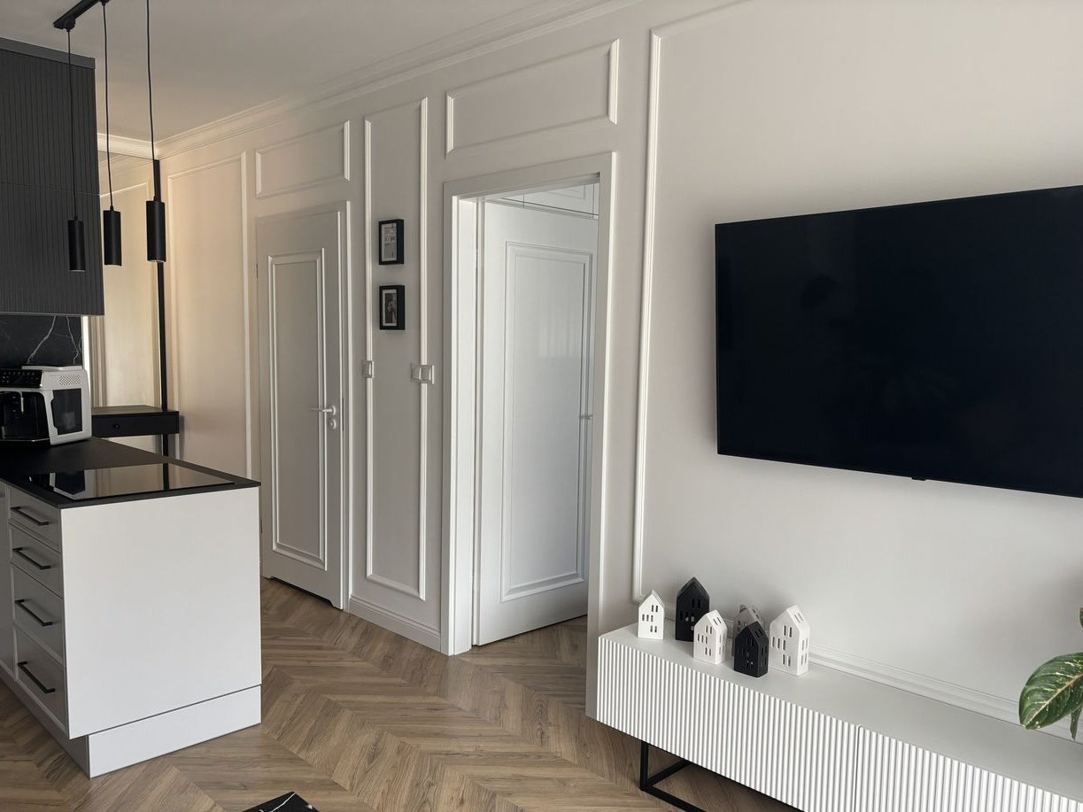 Mieszkanie urządzone zostało w nowoczesnym stylu (lamele, sztukateria poliuretanowa, listwy przysufitowe) z najwyższą starannością o szczegóły. W mieszkaniu zrealizowano zabudowy stolarskie pod wymiar: kuchnię, szafę garderobianą w sypialni oraz szafę na przedpokoju wykonano z lakierowanych na pół-mat płyt MDF, zaś w łazience wykonano zabudowę drewnianą (w tym zabudowę stelaża WC oraz ukrytą szafkę). Nadto kuchnię wyposażono w lodówkę z zamrażalnikiem, piekarnik, zmywarkę i pralkę w zabudowie oraz blat kompaktowy odznaczający się dużą odpornością na zarysowania, wysoką temperaturę i wilgoć. W przedpokoju znajduje się wykonane pod wymiar duże lustro oraz wideodomofon. Okna wykonane z profili PCV, wyposażone w plisowane rolety.