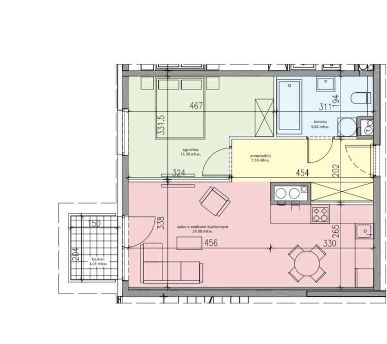dużego pokoju z aneksem kuchennym (24,08m2),
