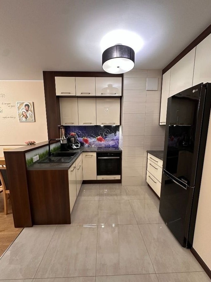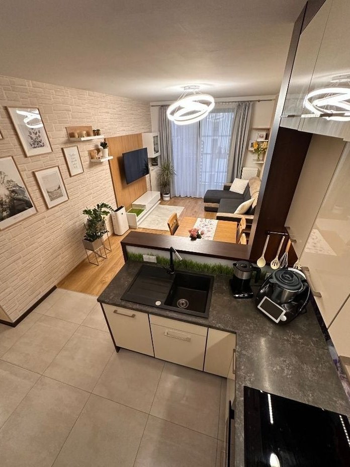 · salon z aneksem kuchennym wyposażonym w bardzo dobrej jakości sprzęt (tj. lodówka, piekarnik, płyta indukcyjna, kuchenka mikrofalowa, zmywarka),