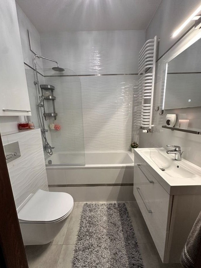 Mieszkanie jest bardzo dobrze doświetlone a układ komunikacyjny już od wejścia tworzy wrażenie przestronności. Całość zaprojektowano w sposób pozwalający maksymalnie wykorzystać każdą przestrzeń i potencjał mieszkania, ze szczególną dbałością o jego funkcjonalny charakter. Niewątpliwym atutem jest pomieszczenie gospodarcze, pełniące jednocześnie funkcję garderoby, pralni, suszarni oraz magazynku.
