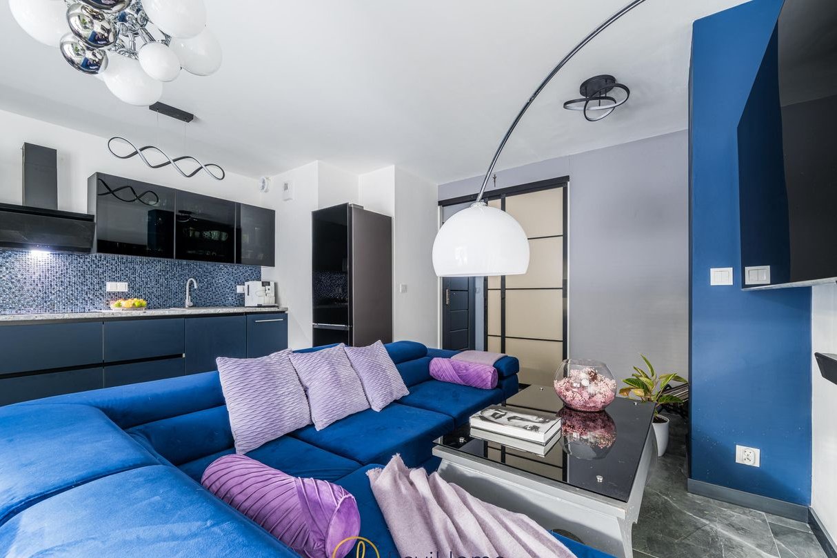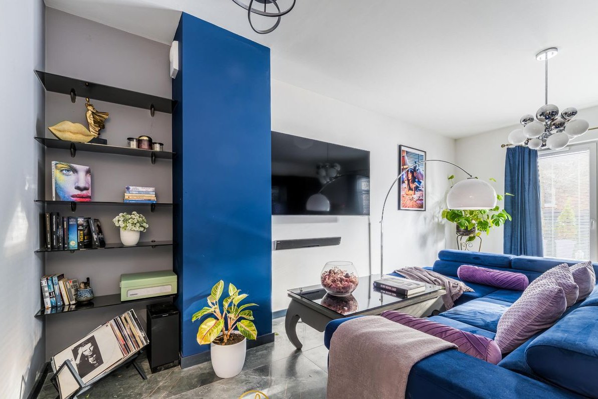 Salon z jadalnią utrzymany w granatowo czarnej kolorystyce połączony jest z aneksem kuchennym w tej samej tonacji, co nadaje spójności i charakteru całemu wnętrzu. Smaku dodaje również nietuzinkowe oświetlenie wnętrza. Znajduje się tu miejsce na wielką kanapę, stolik kawowy oraz półki na książki a także stół jadalniany z krzesłami. Z salonu prowadzi wyjście bezpośrednio na ogród, który jest zagospodarowany w donice, taras wyłożony deskami oraz oczywiście zasiany trawą.