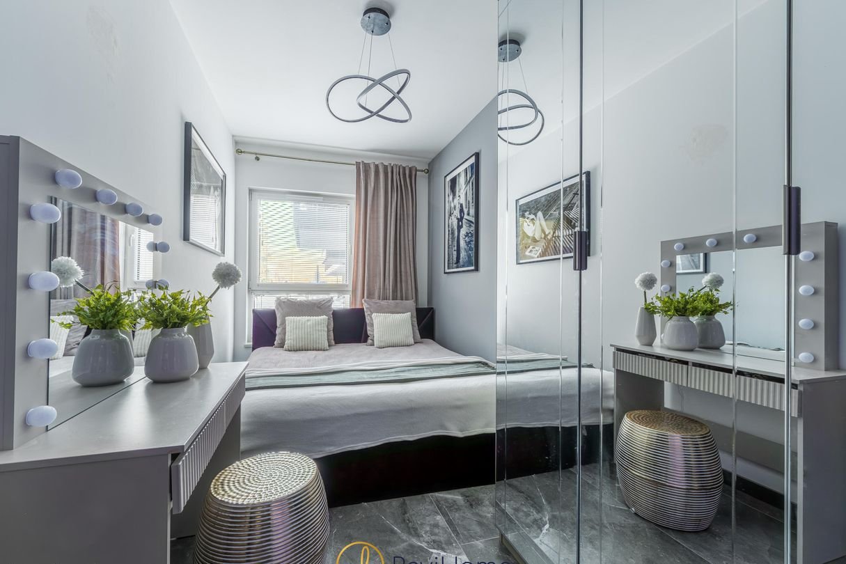 W obu sypialniach znajdują się obecnie podwójne, duże łóżka, szafy wnękowe z lustrami oraz toaletki na kosmetyki. Jeden z pokoi można swobodnie przekształcić w pokój dziecięcy czy też biuro do pracy.