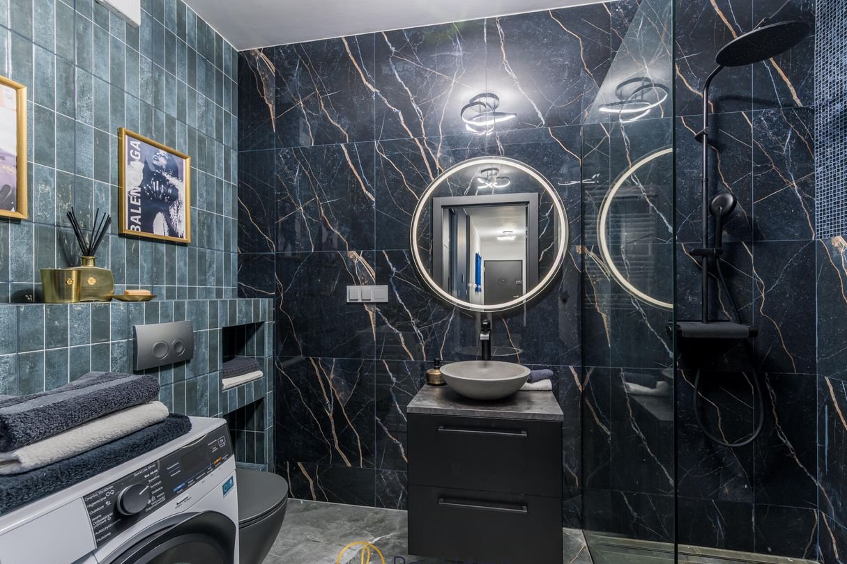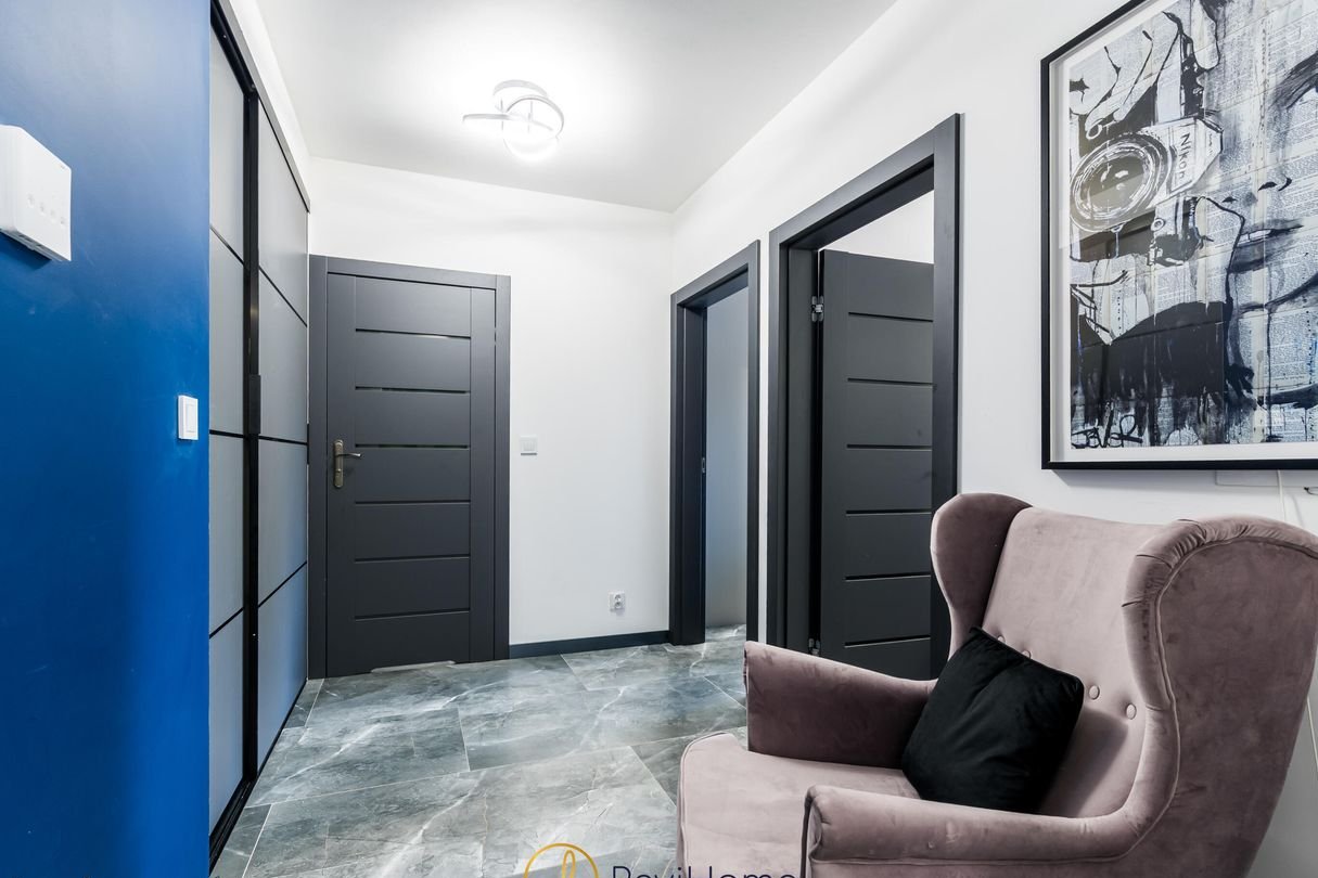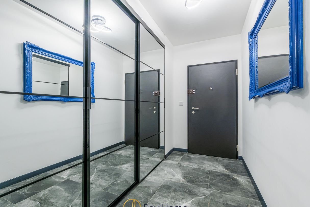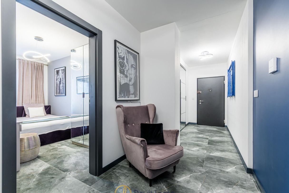 Przestronny i stylowy przedpokój, z którego jest wejście do każdego z pomieszczeń. To tutaj za przesuwnymi drzwiami ukryta jest garderoba. W łazience prysznic typy walk in wielką deszczownicą, pralka oraz szafki.