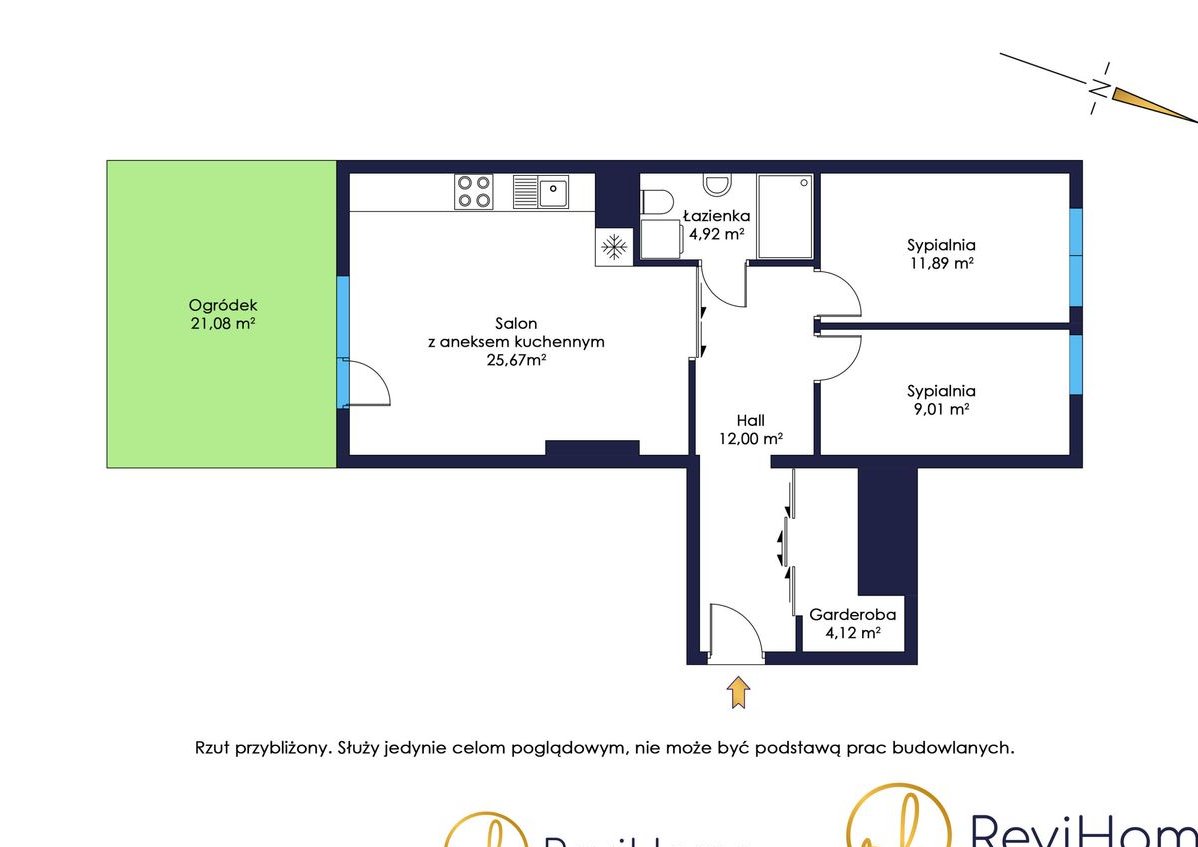 - salon z aneksem kuchennym - 25,67 m2 z wyjściem na ogródek 21,08 m2