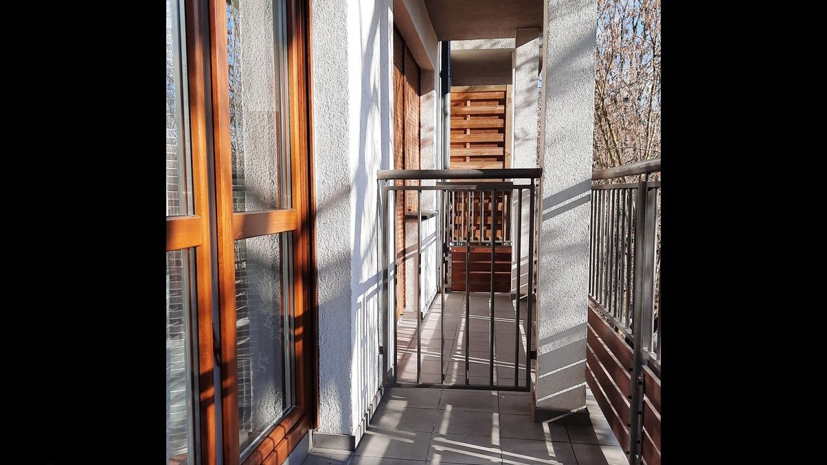 Okno z balkonem skierowane na zieleń. Nie ma zaglądania sobie do okien.