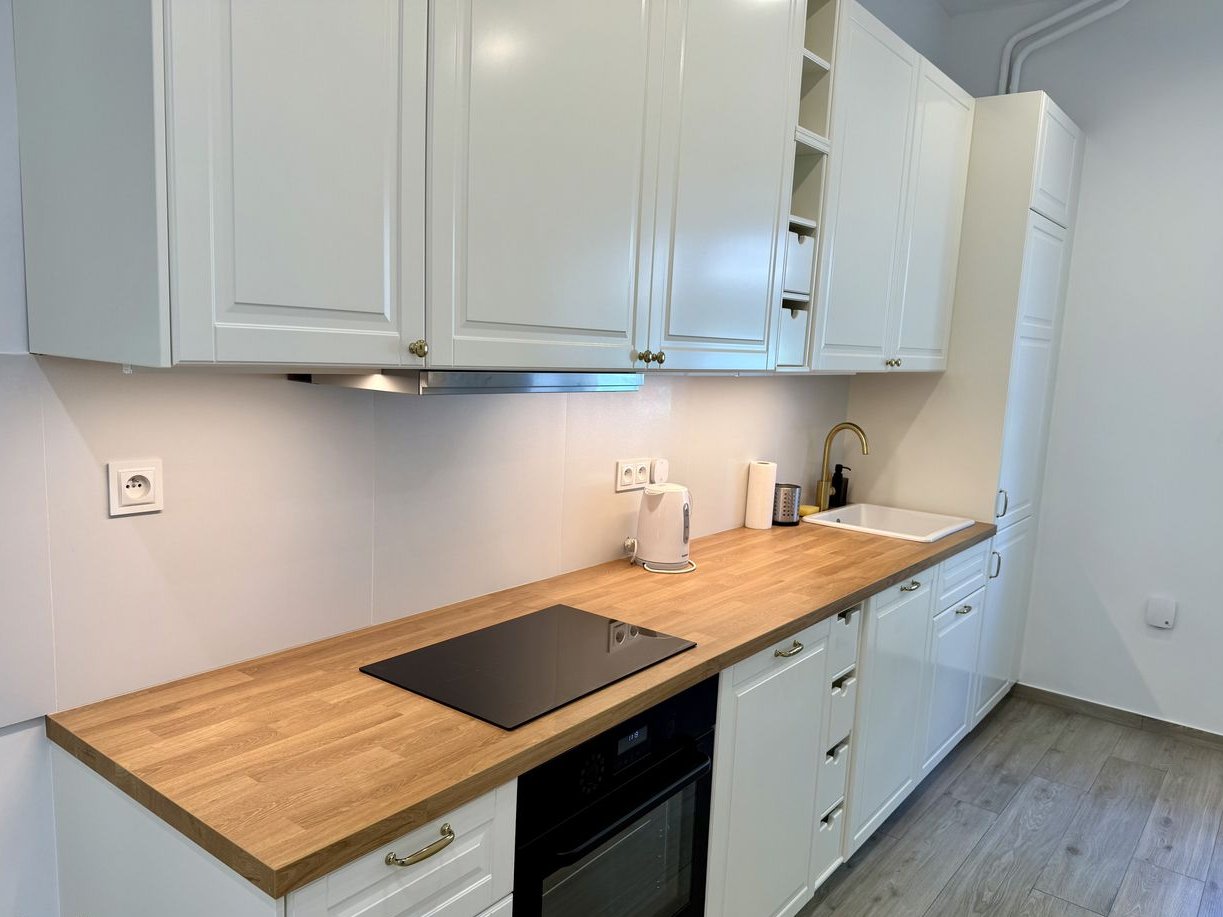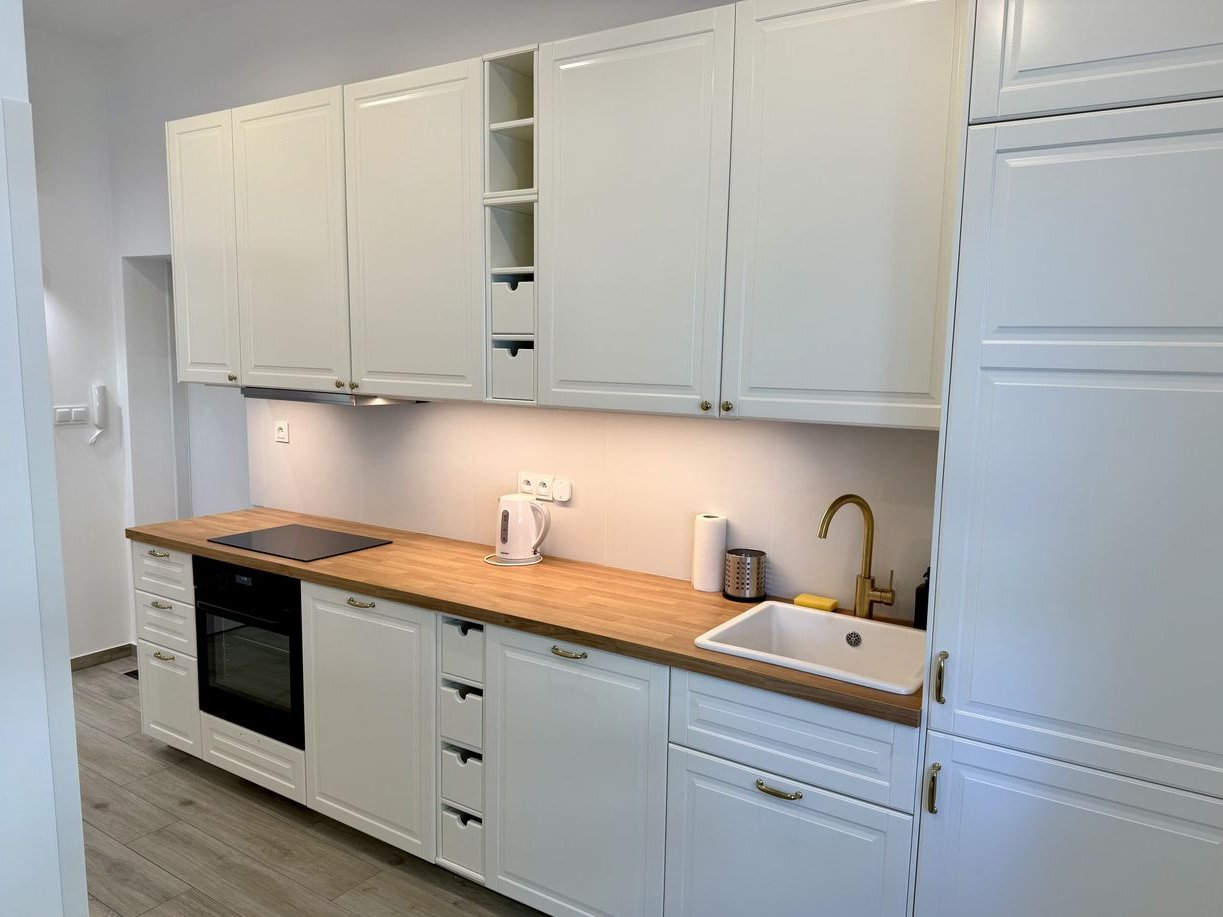nowa kuchnia Ikea z aneksem w pełnej zabudowie: lodówka z zamrażarką, zmywarka, płyta indukcyjna, piekarnik, pralka,