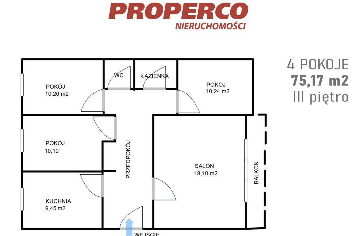 For sale: a 4-room apartment with an area of 75.17 m², located on the 3rd floor of a 4-story building from the 1980s, in the Na Stoku housing estate in Kielce. The building is situated in the center of the estate, close to many shops, a school, a kindergarten, and a health clinic.The apartment consists of four rooms (approx. 18.4, 9.4, 9.6, and 9.7 m²), a separate bright kitchen (approx. 9.6 m²), a bathroom (approx. 3.00 m²), a separate toilet (approx. 1.5 m²), and a hallway. The apartment has a functional layout, is dual-aspect and bright (east-west exposure). The kitchen is fitted with custom-built furniture. The floors in the rooms are finished with panels; the kitchen, hallway, and bathroom have stoneware tiles. Heating and hot water are supplied from the municipal network. The apartment features a spacious balcony. The owner has access to a basement storage room.Maintenance costs: administrative fee to the housing cooperative approx. PLN 1,350 (for 3 people), including advance payments for water, heating, waste disposal, and the renovation fund. Electricity and gas are paid additionally according to meter readings.No energy performance certificate has been prepared for the apartment.For more information in English please call: 888 889 441, e-mail: -Biuro Nieruchomości PROPERCO sp. z o.o. sp.k. współpracuje z doświadczonymi specjalistami finansowymi, oferującymi sprawdzenie zdolności kredytowej oraz przedstawienie oferty finansowania nieruchomości / Informacje dotyczące opisu nieruchomości podane są przez właściciela, mają charakter wyłącznie informacyjny i mogą podlegać aktualizacji. Oferta dotycząca nieruchomości nie stanowi oferty określonej w art. 66 i następnych KC. Nasze usługi świadczymy w oparciu o umowę pośrednictwa, która gwarantuje Państwu opiekę naszego doradcy przez cały okres trwania współpracy. Za wykonaną usługę pobieramy wynagrodzenie zgodnie z warunkami uzgodnionymi w zawartej umowie /// The real estate agency PROPERCO sp. z o.o. sp.k. collaborates with experienced financial specialists, offering creditworthiness assessment and presenting property financing offers. Information regarding property descriptions is provided by the owner, is purely informational, and may be subject to updates. The property offer does not constitute a specific offer as defined in Art. 66 and subsequent articles of the Civil Code. Our services are provided based on a brokerage agreement, ensuring you the care of our advisor throughout the entire collaboration period. We charge a fee for the services rendered according to the terms agreed upon in the concluded agreement.Zapraszamy do siedziby naszego biura w Kielcach przy ul. Koziej 3a/1. /// We invite you to visit our office located in Kielce at 3a/1 Kozia Street.Dane adresowe /// Address details:PROPERCO sp. z o.o. sp.kul. Kozia 3a/125-514 Kielcetel. kom: +48 692-024-827/