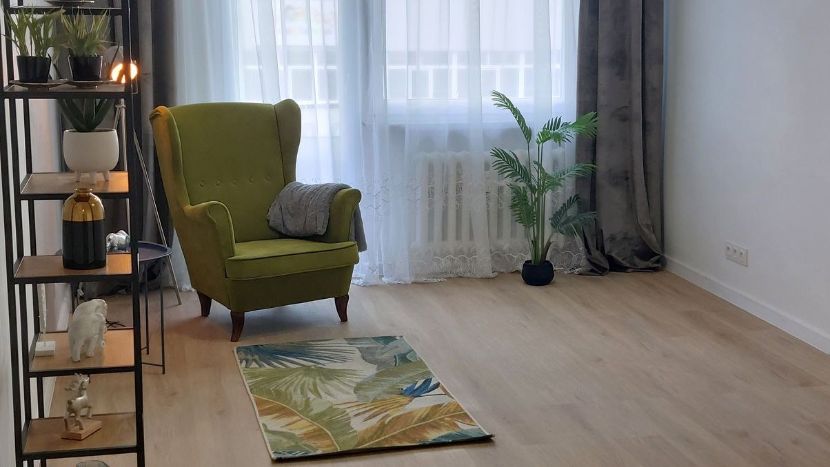 Mieszkanie zostało przeprojektowane w taki sposób żeby poprawić jego funkcjonalność i wygodę. Mieszkanie rozkładowe po lewej stronie znajdują się salon z aneksem kuchennym i balkonem, okna wychodzą na południe. Dwie sypialnie znajdują się po prawej stronie i ich okna wychodzą na podwórko od strony północnej.