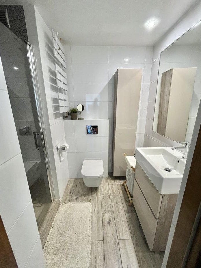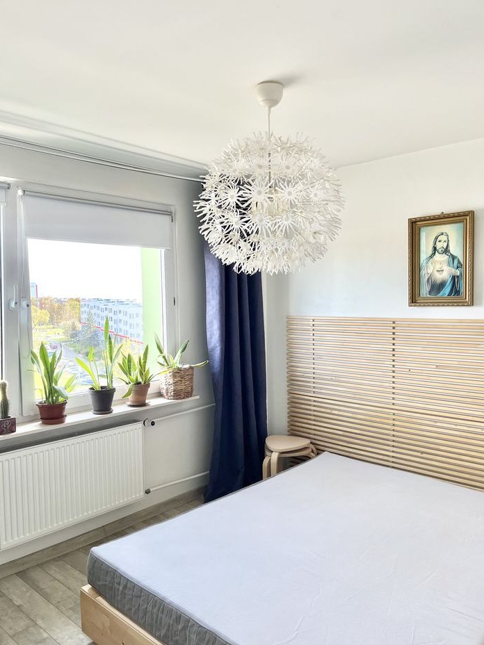 Sprzedam mieszkanie z balkonem na 8 piętrze w 10-piętrowym bloku. Powierzchnia, niecałe 58m2. Mieszkanie składa się z 2 pokoi. Salon połączony jest z kuchnią, dzięki czemu zyskujemy dużą otwartą przestrzeń, drugi pokój jest zagospodarowany na sypialnię. Osobna łazienka z prysznicem walk in (zamykana szyba, dzięki czemu nie jest zimno :)) i duży przedpokój. Jeśli jest potrzeba, można sobie oddzielić pokój na 2 osobne pomieszczenia i zrobić np. osobną sypialnię i dodatkowy pokój. Korytarz do mieszkania jest oddzielony drzwiami na kod. Klatka również zabezpieczona jest otwarciem na kod. Obok mieszkania jest wspólna komórka lokatorska. Przy bloku znajduje się winda, więc dodatkowe udogodnienie dla wózków/niepełnosprawnych. W bloku są 2 windy. Jedna większa/towarowa i druga standardowa mniejsza/osobowa. Czynsz około 1200 zł z wszystkimi zaliczkami, śmieciami, itp. na 2 osoby.