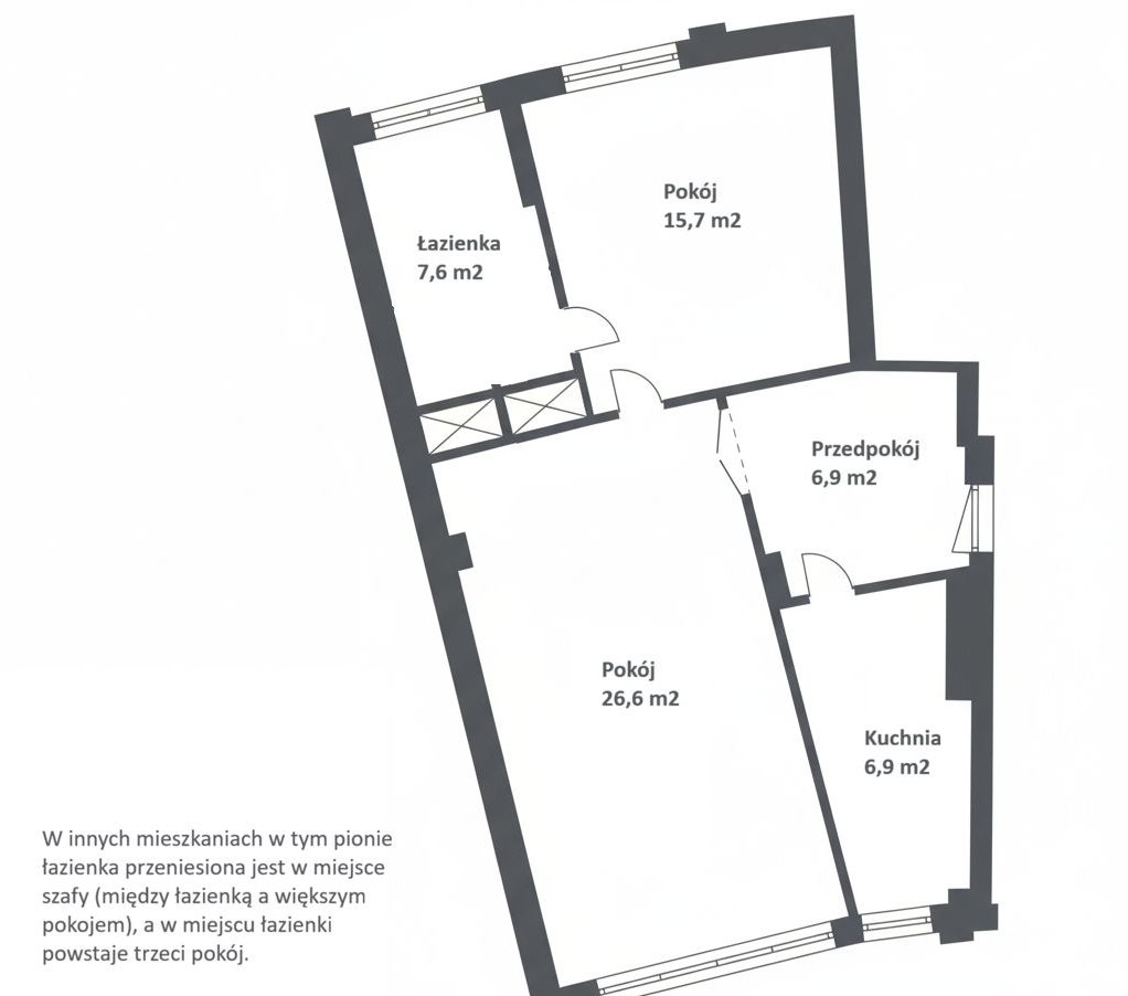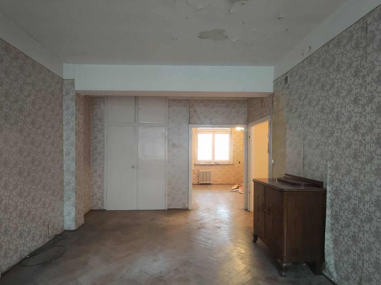 Mieszkanie kwalifikuje się do kapitalnego remontu. Obecnie składa się z 2 dużych pokoi, osobnej kuchni, łazienki z oknem i przestronnego przedpokoju, ale przy okazji remontu bez problemu można wydzielić 3 osobne pokoje. Wysokie 3-metrowe sufity. Do mieszkania przynależy duża piwnica ok. 10 m2. Nie ma balkonu.