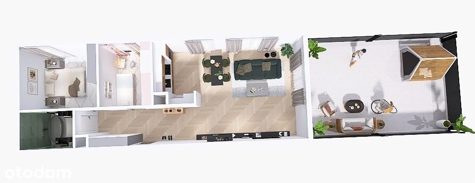 Układ mieszkania jest przemyślany – salon z aneksem kuchennym i wyjściem na taras tworzy komfortową strefę dzienną, a dwie sypialnie zapewniają prywatność. Dodatkowe wnęki pod szafy w zabudowie oraz ustawna łazienka sprawiają, że lokal jest niezwykle funkcjonalny.