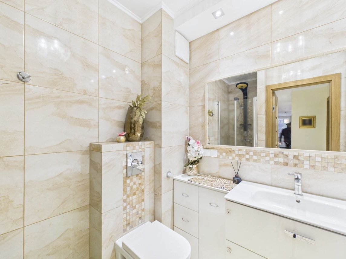 * łazienka wyposażona jest w wannę oraz w prysznic