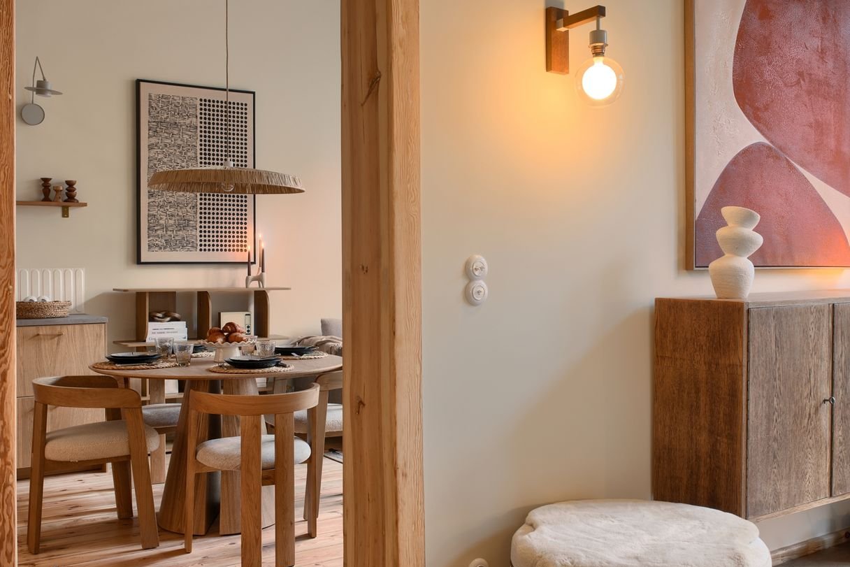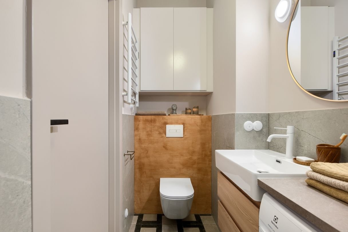 Naturalne drewno na podłogach prowadzi przez całe mieszkanie, nadając mu ciepło i szlachetność. Jasna, stonowana paleta barw, miękkie tkaniny i subtelne oświetlenie budują atmosferę spokoju.