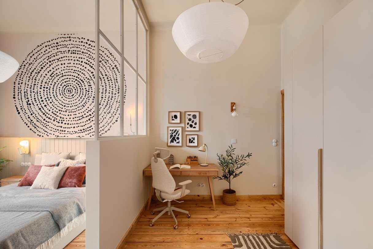 Wysokie sufity i lekkie przeszklenie subtelnie wydzielają przestrzeń do pracy — tworząc naturalne miejsce na domowe biuro bez zabierania światła.