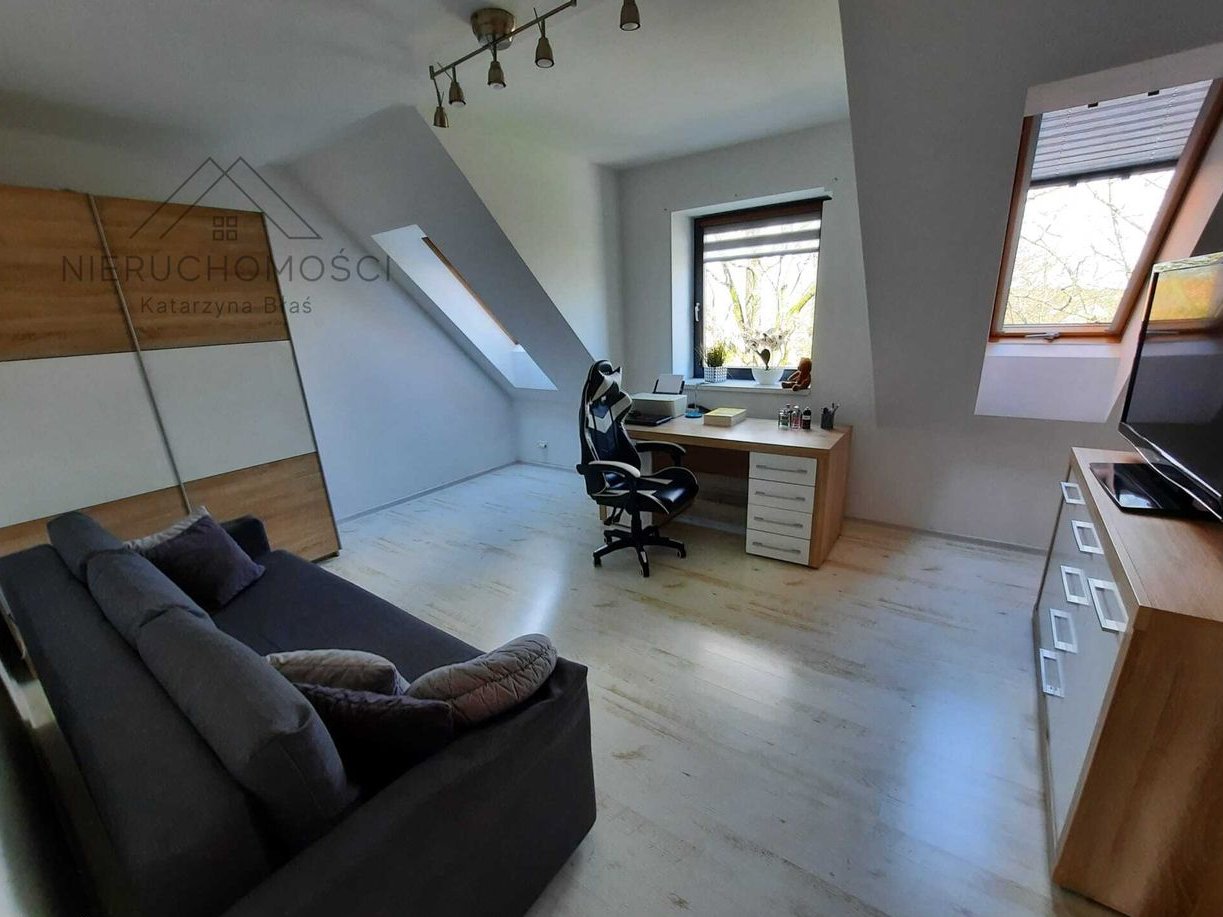 Sypialnia położona na drugim poziomie została wyposażona przez właścicieli w przestronną garderobę, dzięki której łatwo utrzymać porządek oraz oszczędzić czas dzięki dobrze zagospodarowanej przestrzeni.