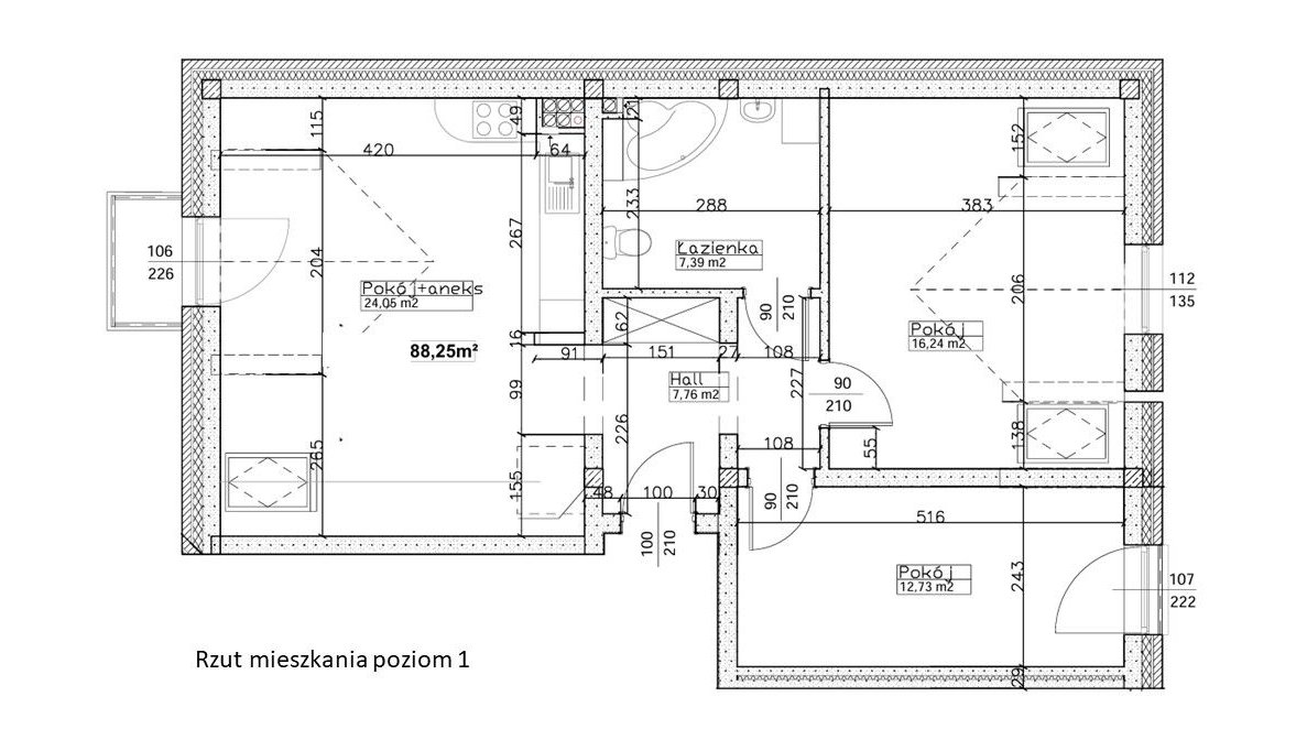 Powierzchnia mieszkania wynosi 114,34 m2 liczona zgodnie z przepisami budowlanymi ze względu na liczne skosy. Powierzchnia mieszkania liczona po podłodze ma około 150 m2!