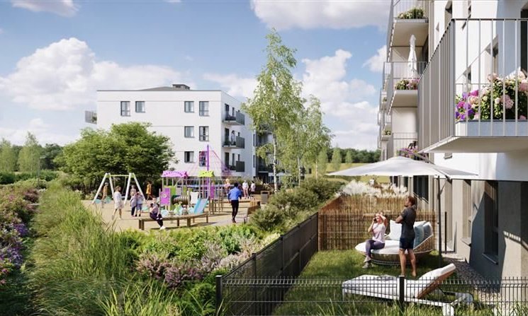 *tereny zielone i place zabaw dla dzieci w otoczeniu różnorodnej roślinności oraz drzew, które tworzą przyjazną przestrzeń do wypoczynku i rekreacji dla mieszkańców.