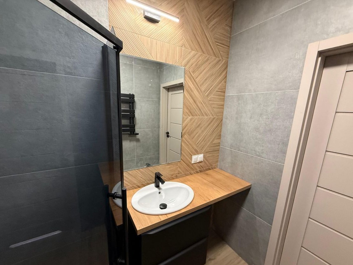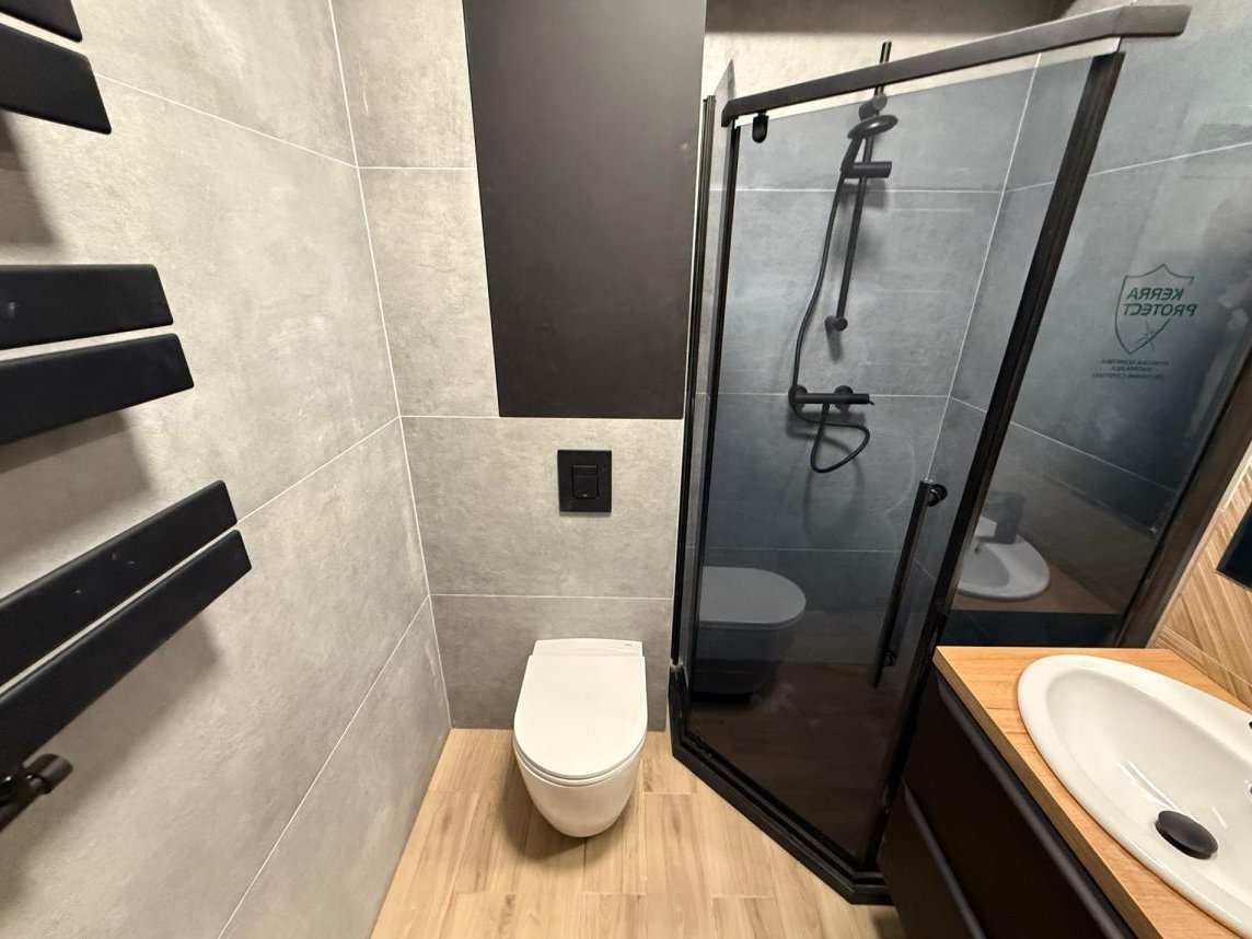 Łazienka urządzona w nowoczesnym stylu z prysznicem.