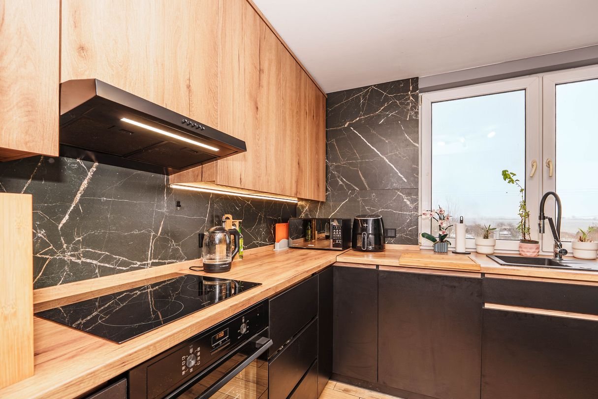 Nowoczesny standard: mieszkanie wykończone z dbałością o detale (loftowe akcenty, beton, czerń i naturalne drewno).