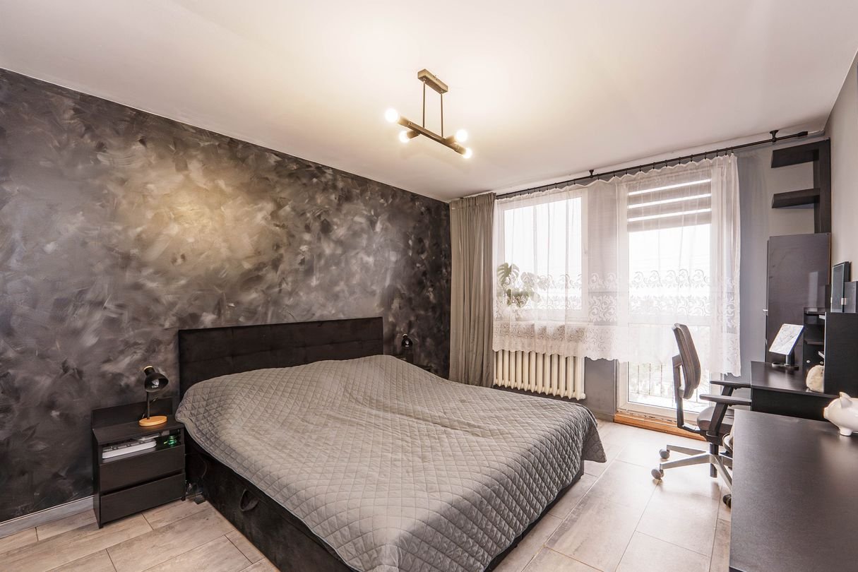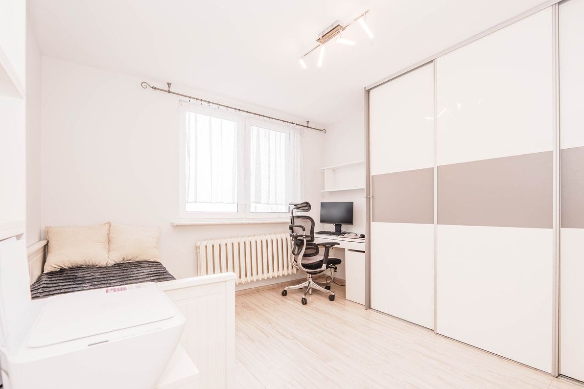 Drugi pokój (Gabinet / Pokój Dziecka): jasne i ustawne pomieszczenie z oknem oraz bardzo pojemną szafą w zabudowie. Idealne do pracy zdalnej lub dla dziecka.