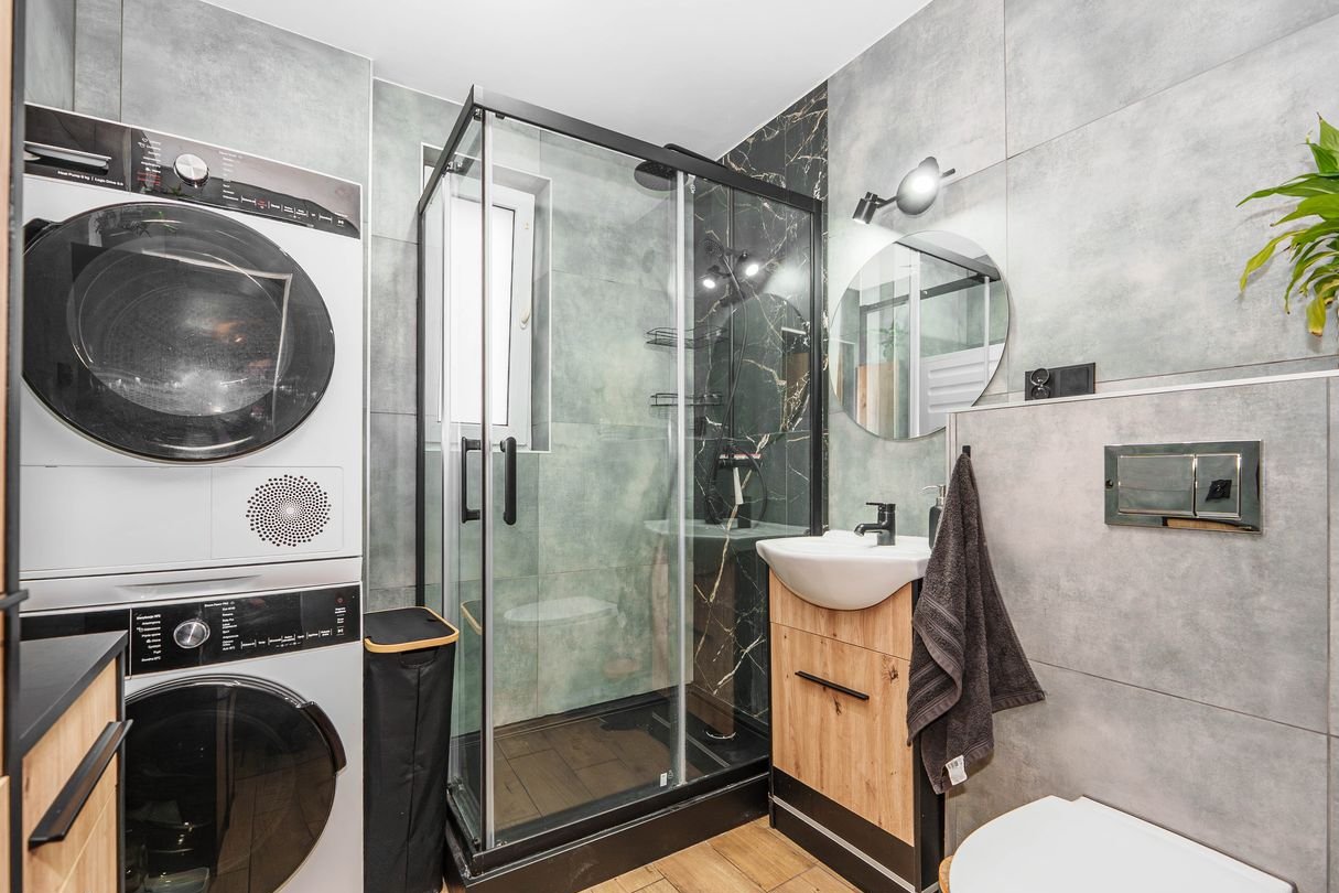 Łazienka: wykończona w modnym stylu betonowym, wyposażona w prysznic oraz praktyczny "słupek" na pralkę i suszarkę.