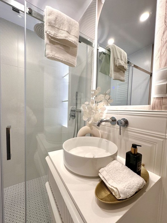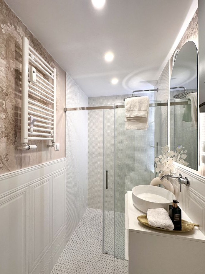Łazienka: prysznic walk-in, drzwi ukryte ENTRA Linate Zero, baterie poddtynkowe KFA, umywalka i szafka podumywalkowa z szufladami, duże lustro z podświetleniem LED i ogrzewaniem (antypara), WC Grohe, ogrzewanie podłogowe, grzejnik drabinkowy.
