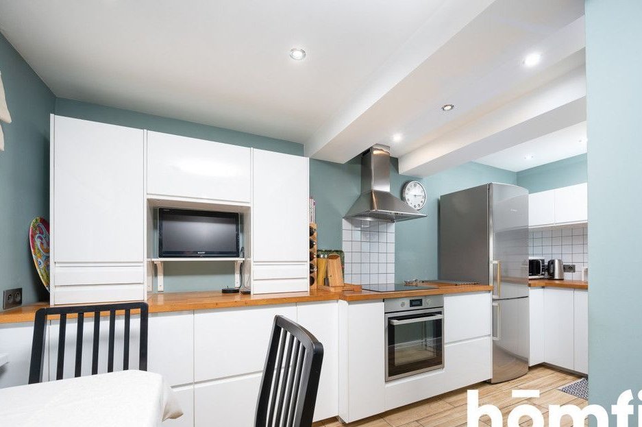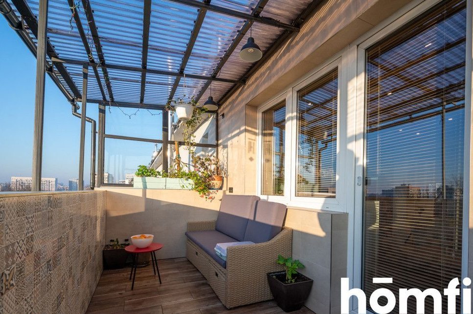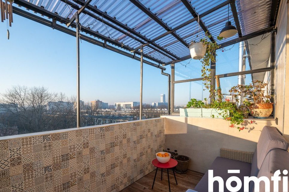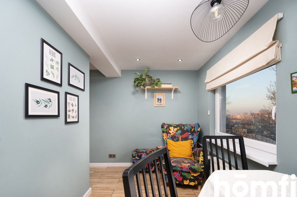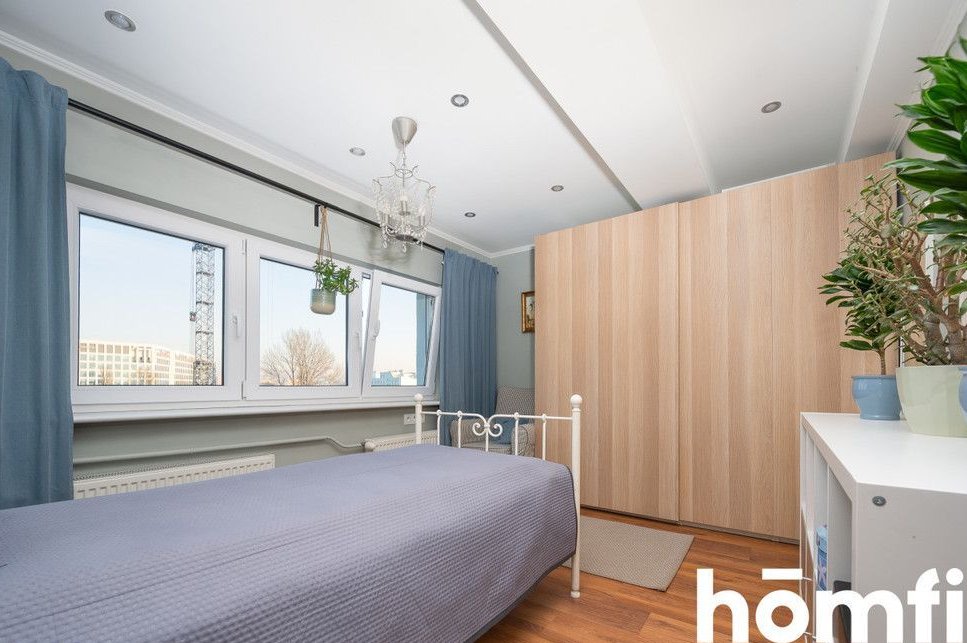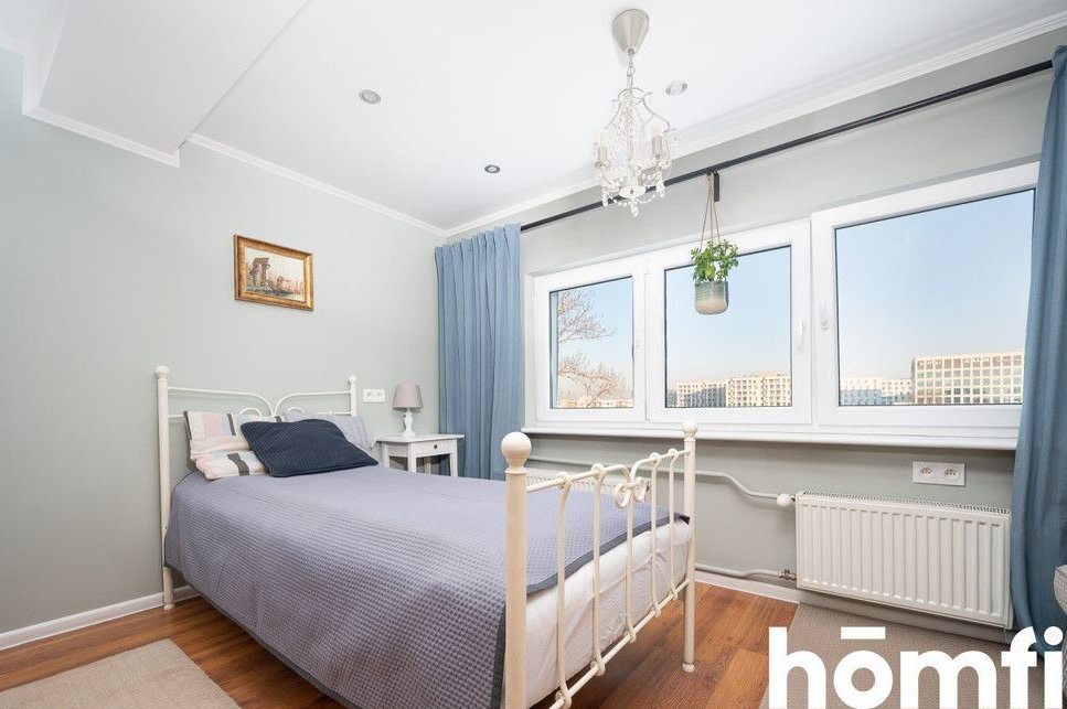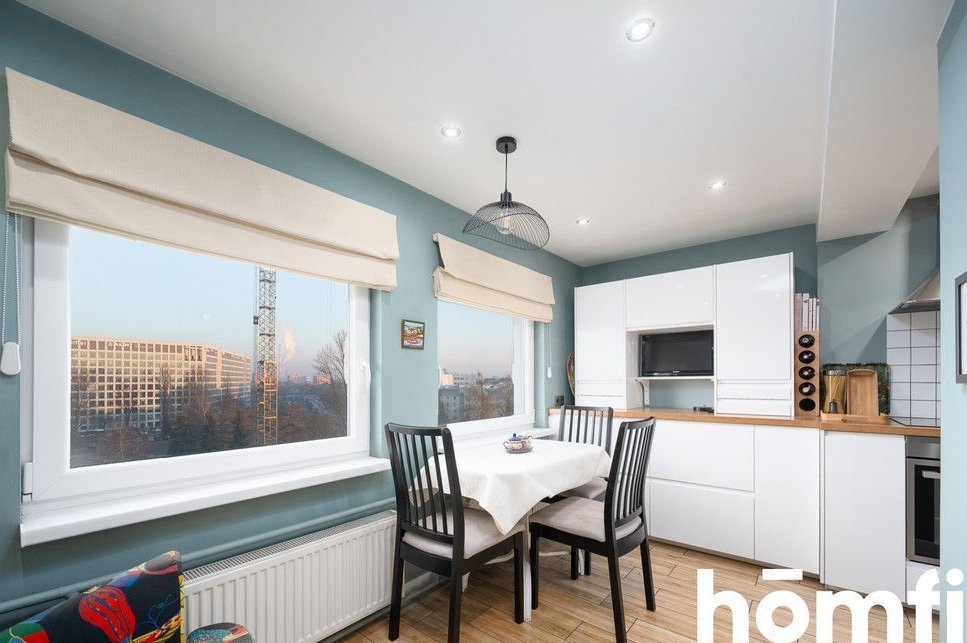 The apartment has an area of 80m2 and consists of a living room connected to a dining room with access to a balcony with a beautiful view of the whole of Krakow, a separate kitchen with a dining area, two bedrooms with lots of windows, a bathroom with a bathtub and toilet, a separate laundry room, and a spacious hall with lots of deep wardrobes for storage. The apartment has a balcony. The apartment has windows on several sides, thanks to which it is very well lit. The view from the balcony also includes Wawel Castle, and in good weather you can see the Tatra Mountains. The balcony is covered, so you can relax on it even in bad weather.
