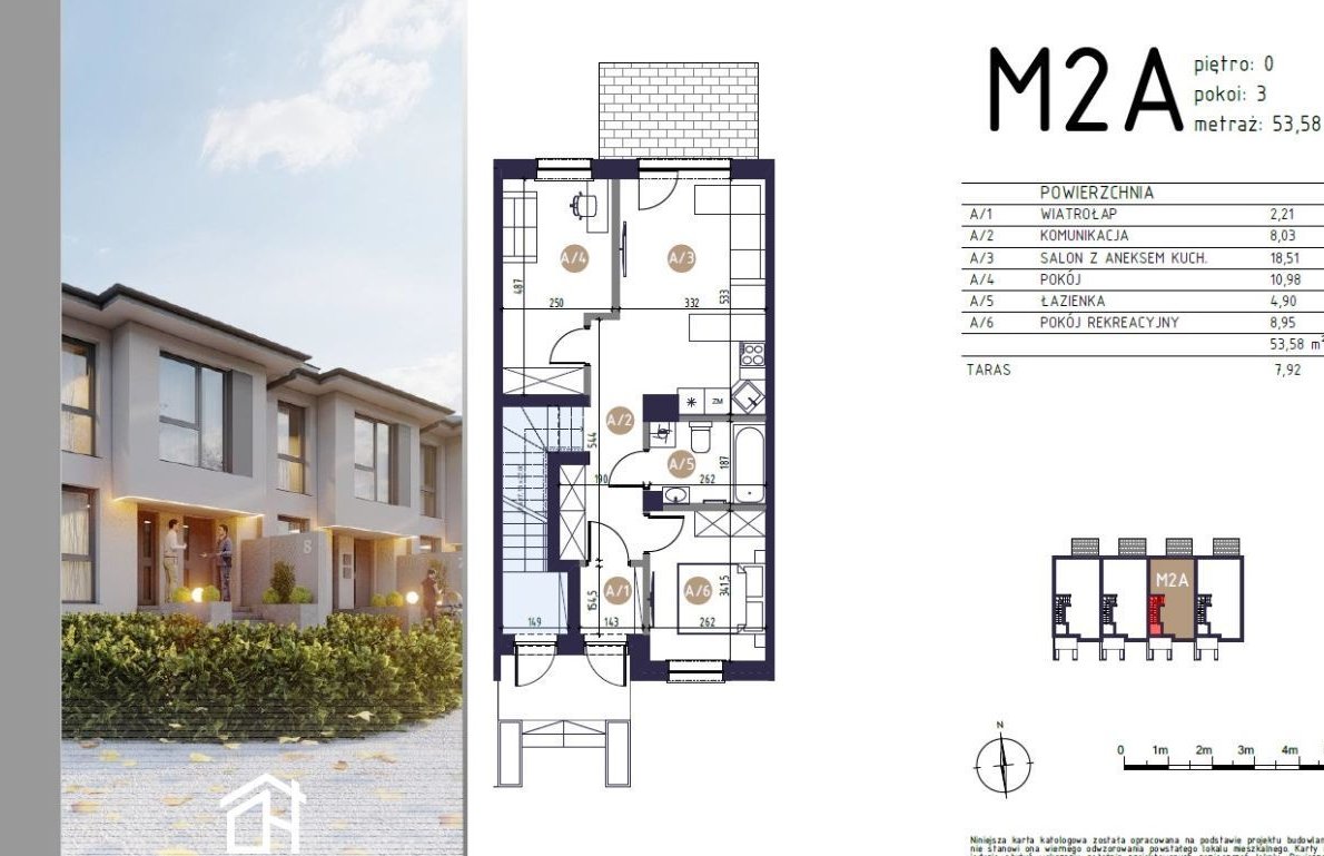 - powierzchnia: 53,58m2 – 3 pokoje plus taras z ogródkiem ok 30m2