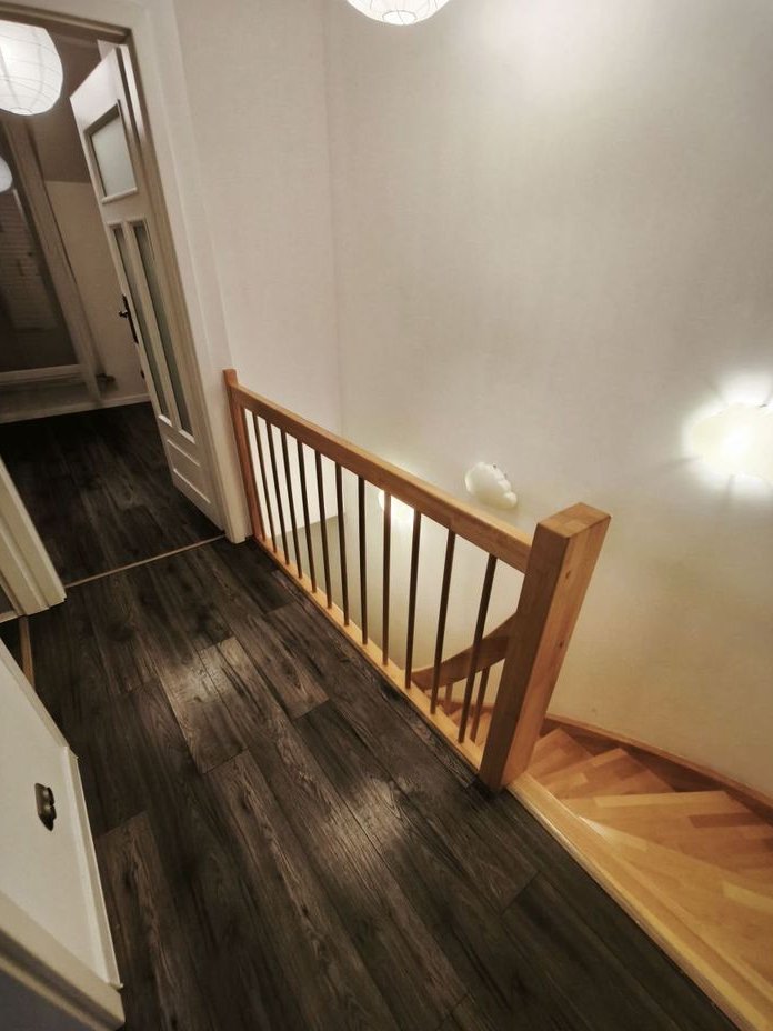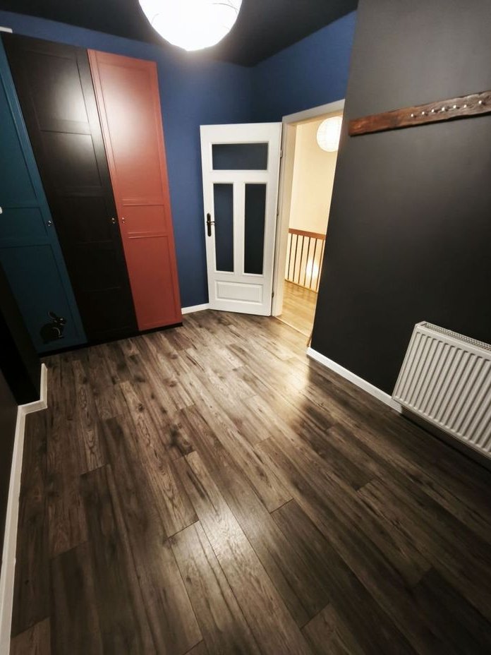 Bardzo funkcjonalnie została zagospodarowana zamknięta drzwiami przestrzeń pod schodami - pod schodami są półki, które służą do przechowywania rzeczy sezonowych oraz otwór w drzwiach przystosowany do posiadania zwierząt (legowisko/kuweta).