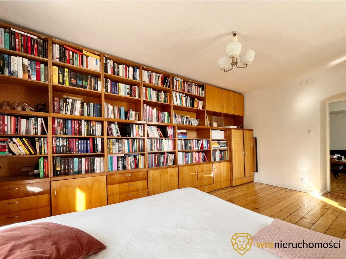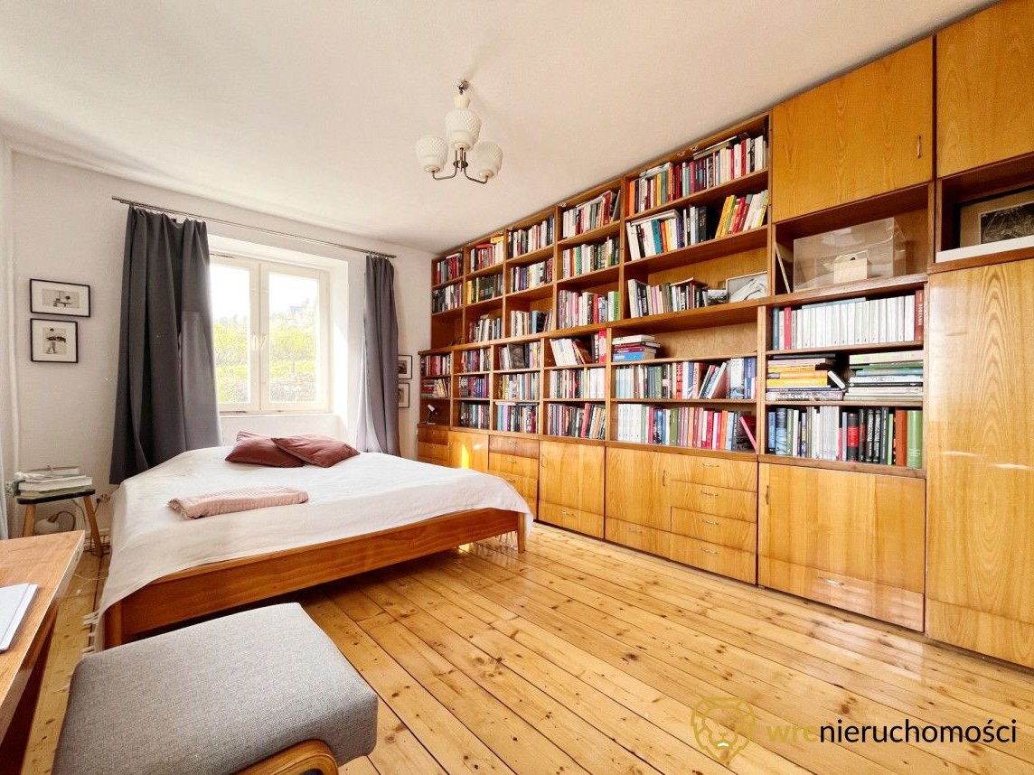 Sypialnia z dużym łóżkiem, oraz licznymi regałami na książki