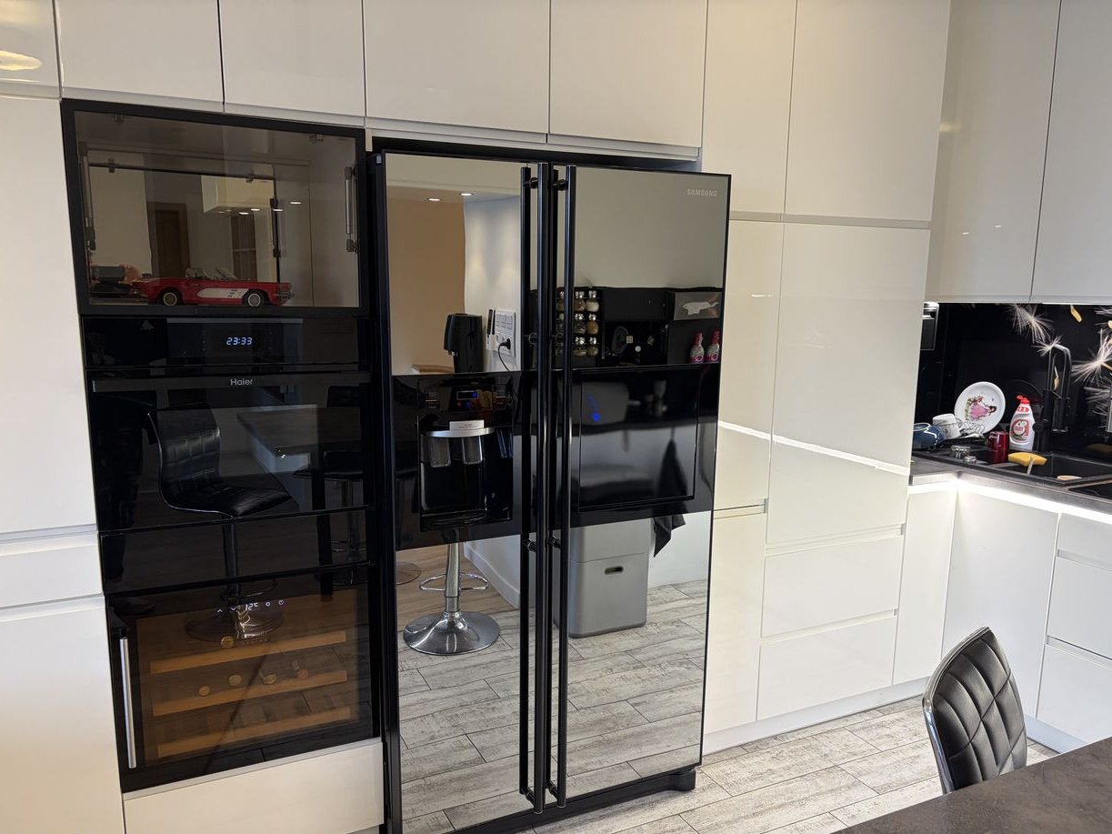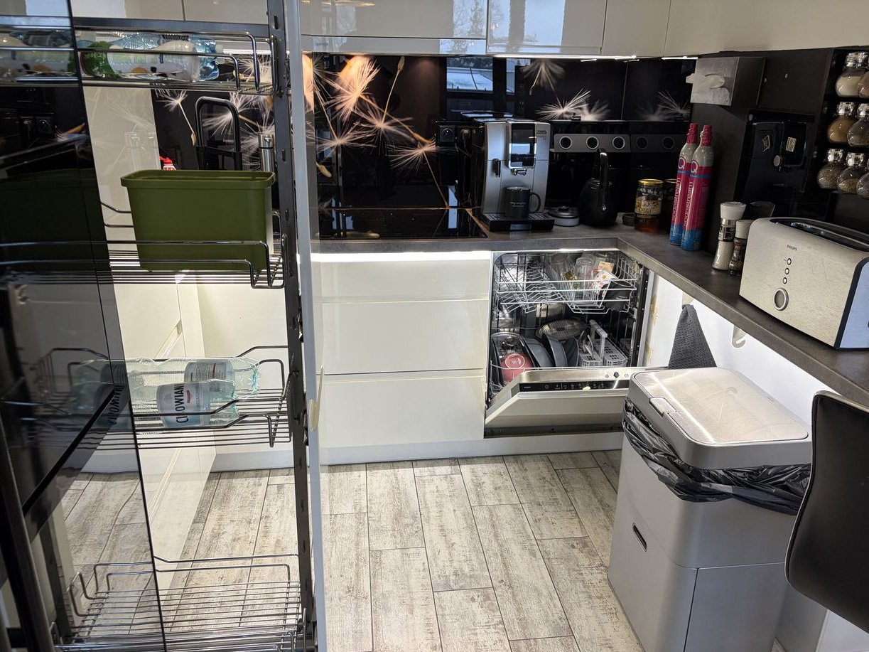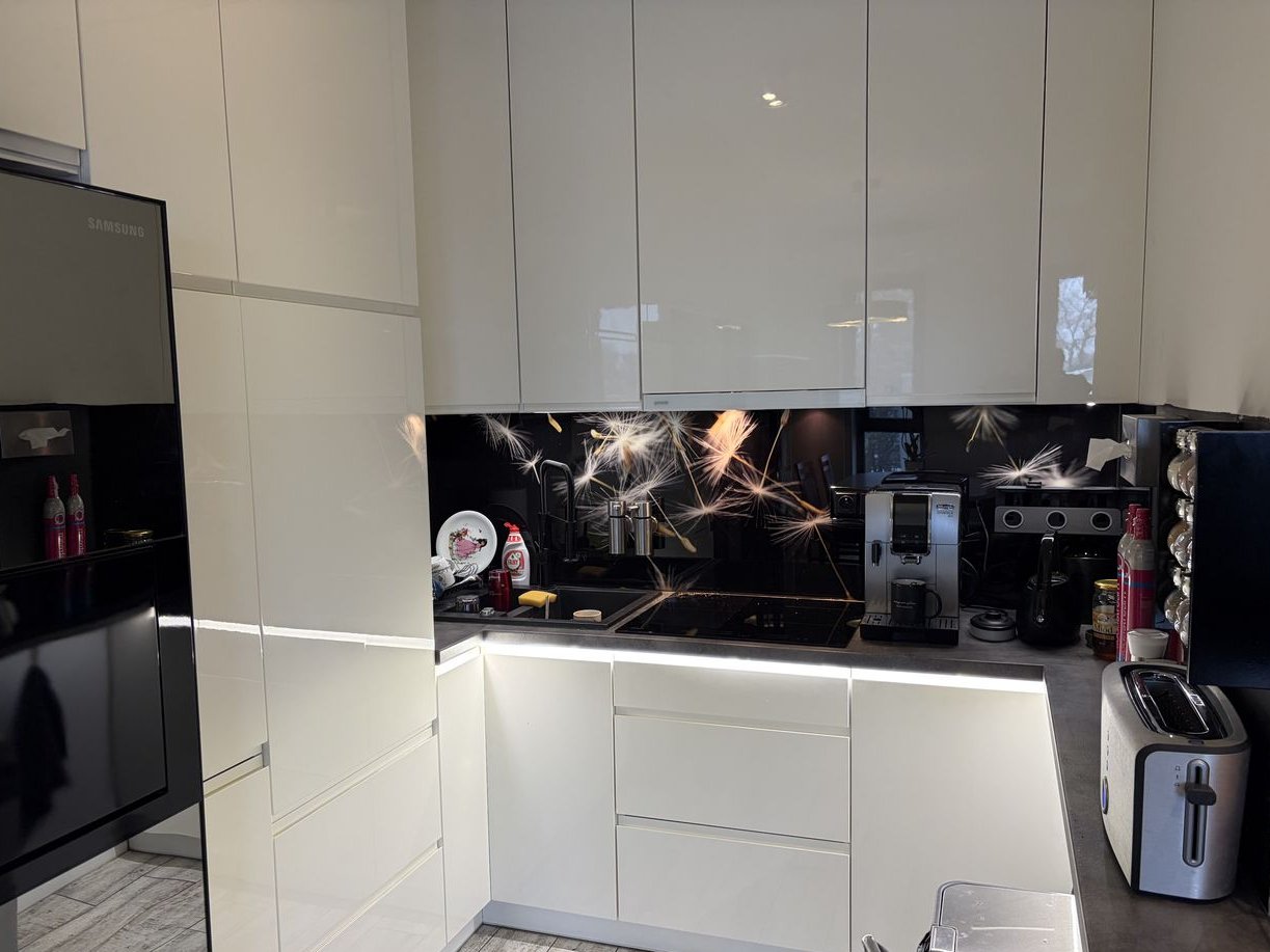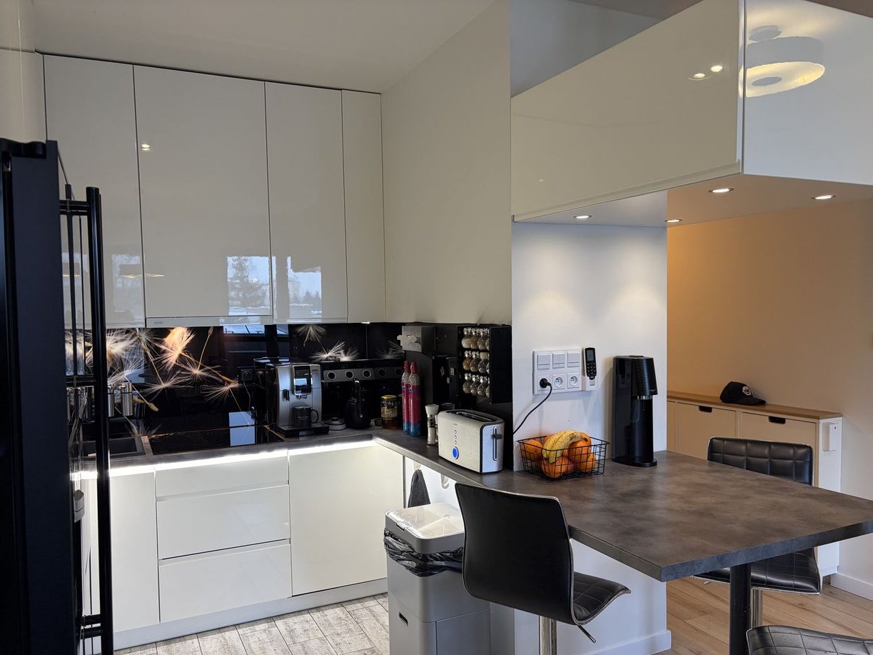 Kuchnia wyposażona w lodówkę na wina, płytę elektryczną Haier (ok. roczną), mikrofalówkę z funkcją grilla Haier (ok. roczną), duże i małe cargo, wyciąg nad płytą zmywarkę (ok. roczną) oraz lodówkę side by side (LG) z bezpośrednim podłączeniem do wody - automatyczna kostkarka i dozownik wody a ponadto w podstawowy sprzęt (czajnik Casa Bugatti Jacqueline), toster (Philips), Soda Stream. W kuchni jest oświetlenie Led nadblatowe i podblatowe.