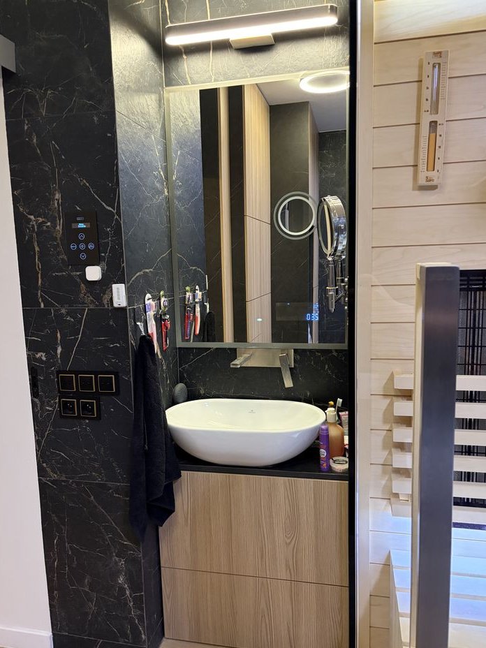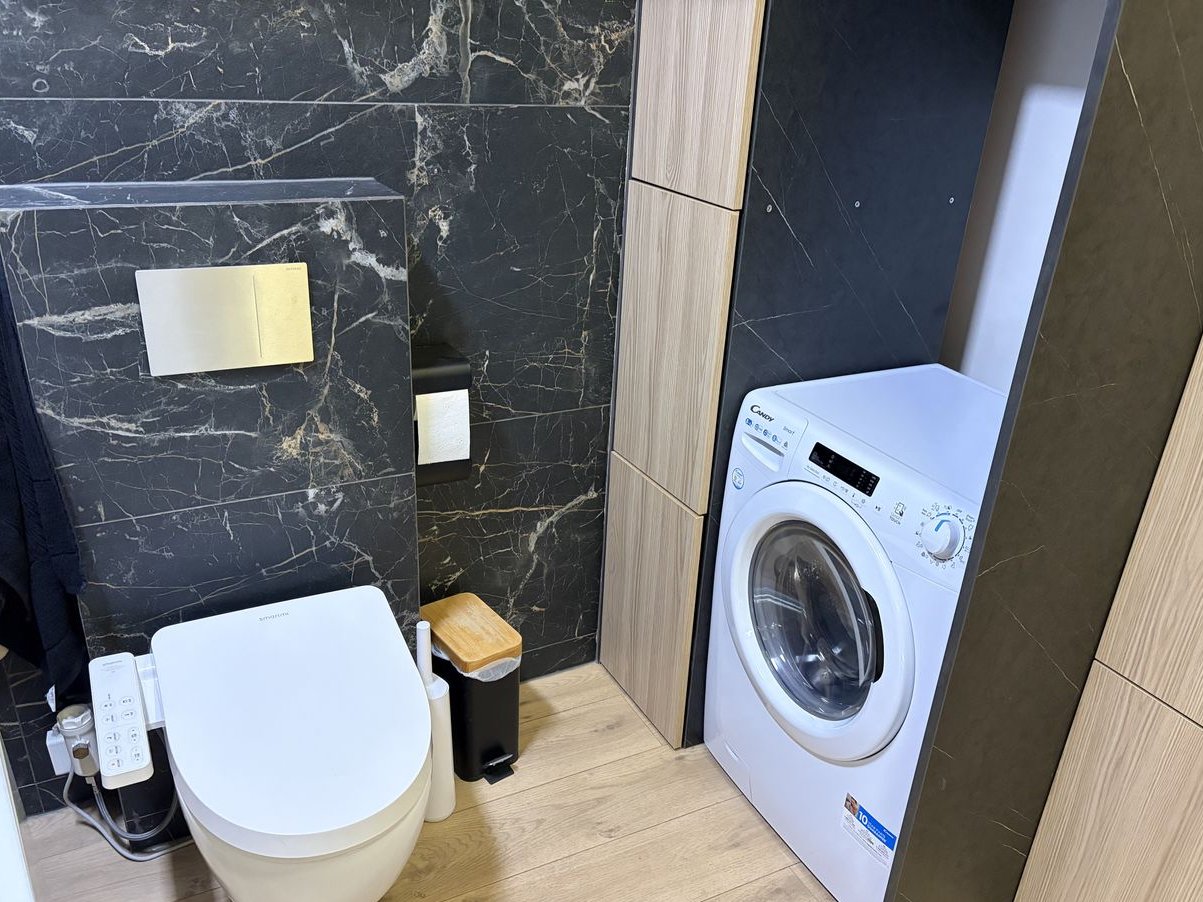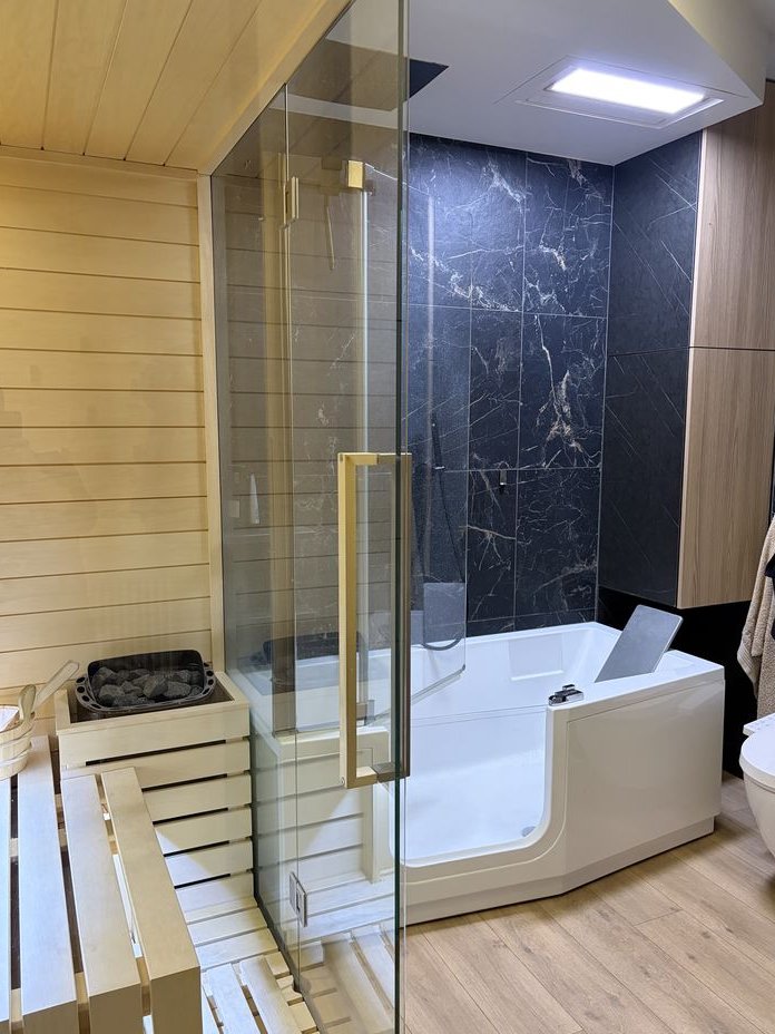 Łazienka wyposażona jest w pralko-suszarką Candy (ok. roczna), deskę sedesową w funkcją bidetu (także kobiecego) i podgrzewaniem, wannę z funkcją łatwego wejścia (otwierane drzwiczki rozwiązanie idealne dla osób starszych) oraz trzema wyjściami źródła wody (prysznic, kran, deszczownica) oraz sauną (fińska oraz infrared). Ponadto w łazience zamontowane są głośniki bluetooth (jeden w części głównej, drugi w saunie) a także lustro wyświetlające godzinę i dane pogodowe (po podłączeniu do wifi). Dużą zaletę sauny infrared jest możliwość korzystania także przez dzieci.