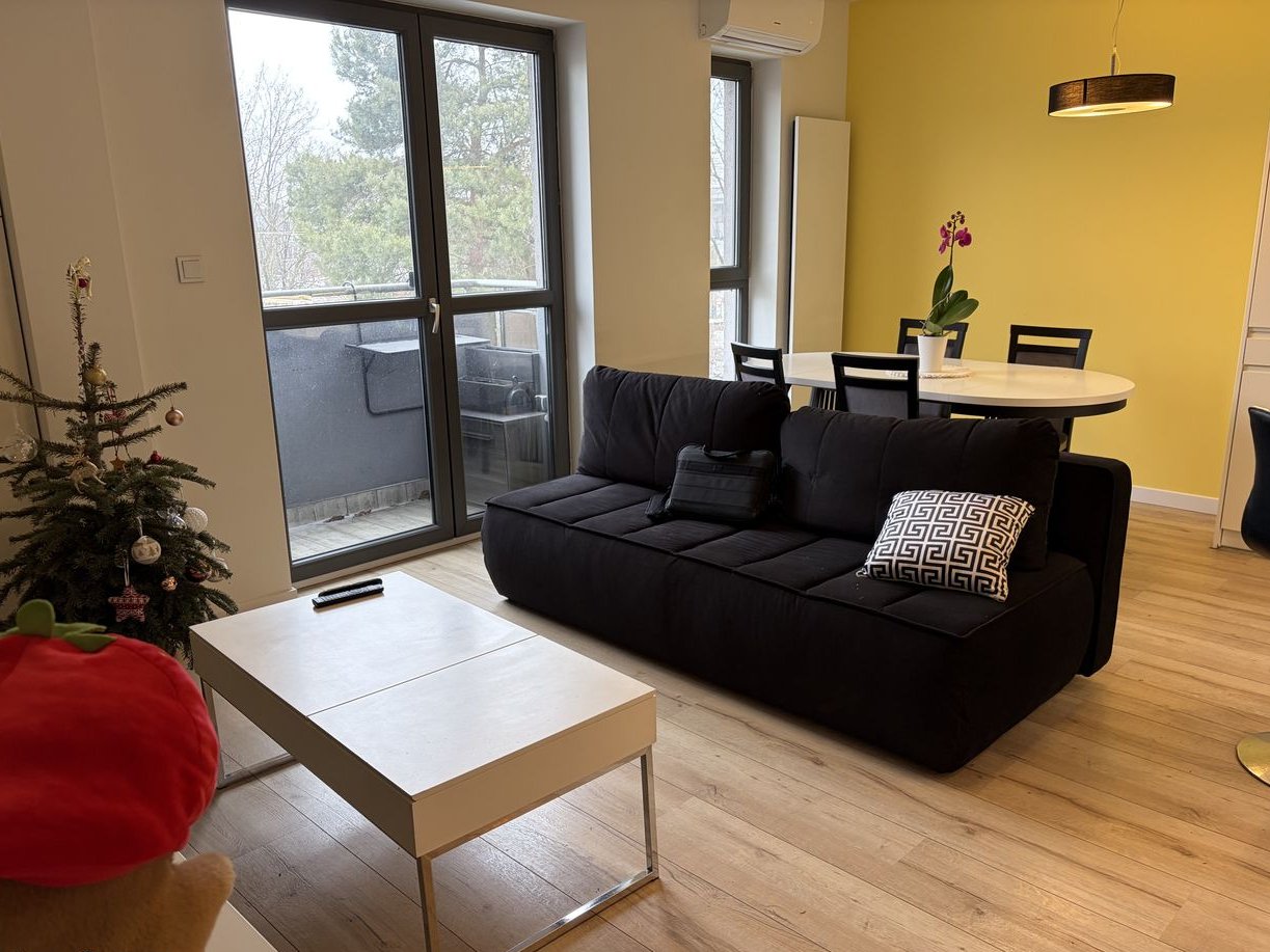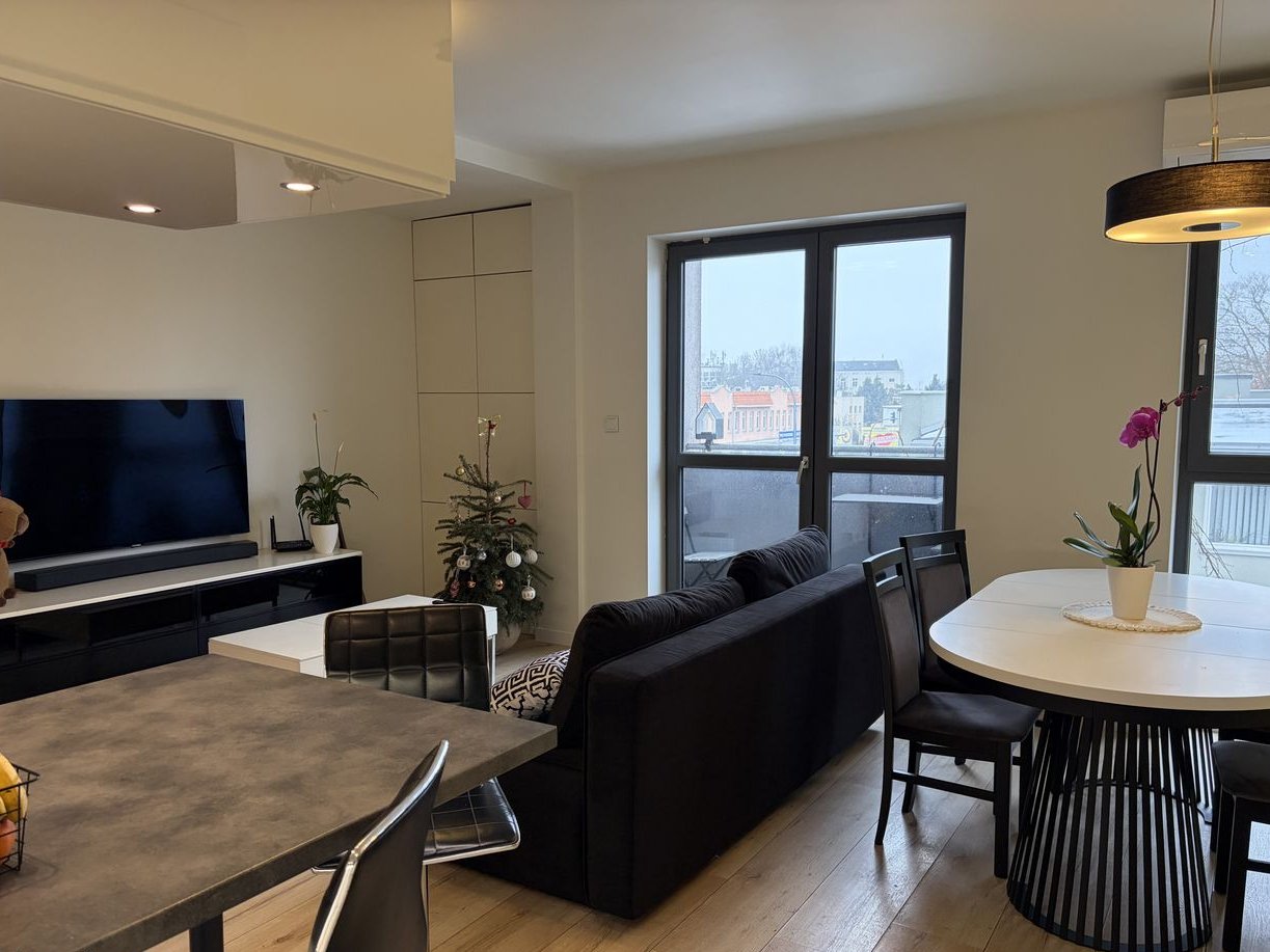 Mieszkanie wykończone w wysokim standardzie w pełni wyposażone (w kuchni oprócz sprzętów są także podstawowe naczynia i sztućce) oraz dodatki takie jak deska do prasowania, drabina, dwa odkurzacze (zwykły oraz ręczny/pionowy Miele). W pokojach na podłodze są panele (salon-laminowane, łazienka-winylowe) oraz płytki w części kuchennej. Sypialnia oraz pokój wyposażone w klimatyzację. W dwóch pokojach telewizory, w salonie z sounbarem. Dwa pokoje mają możliwość podłączenia tv satelitarnej (salon + dziecięcy) i dwa tv kablowej (salon + sypialnia) - przygotowane instalacje (w tym zamontowany talerz), kwestia podpisania umów.