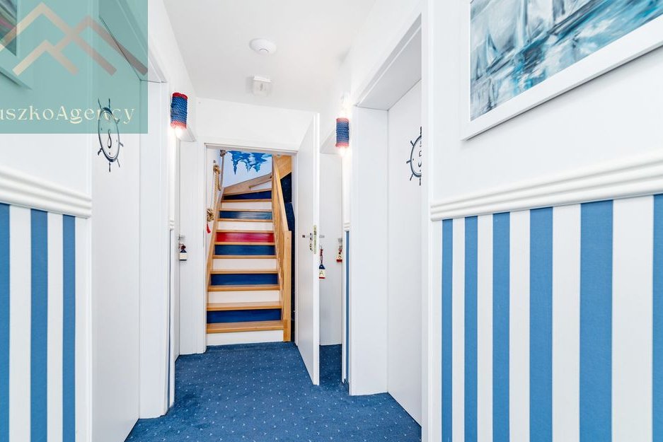 Wnętrza utrzymane są w spójnym, marynistycznym stylu, który nadaje całości wyjątkowy, mazurski charakter. Część elementów wyposażenia wykonano na indywidualne zamówienie, według projektu właścicieli.