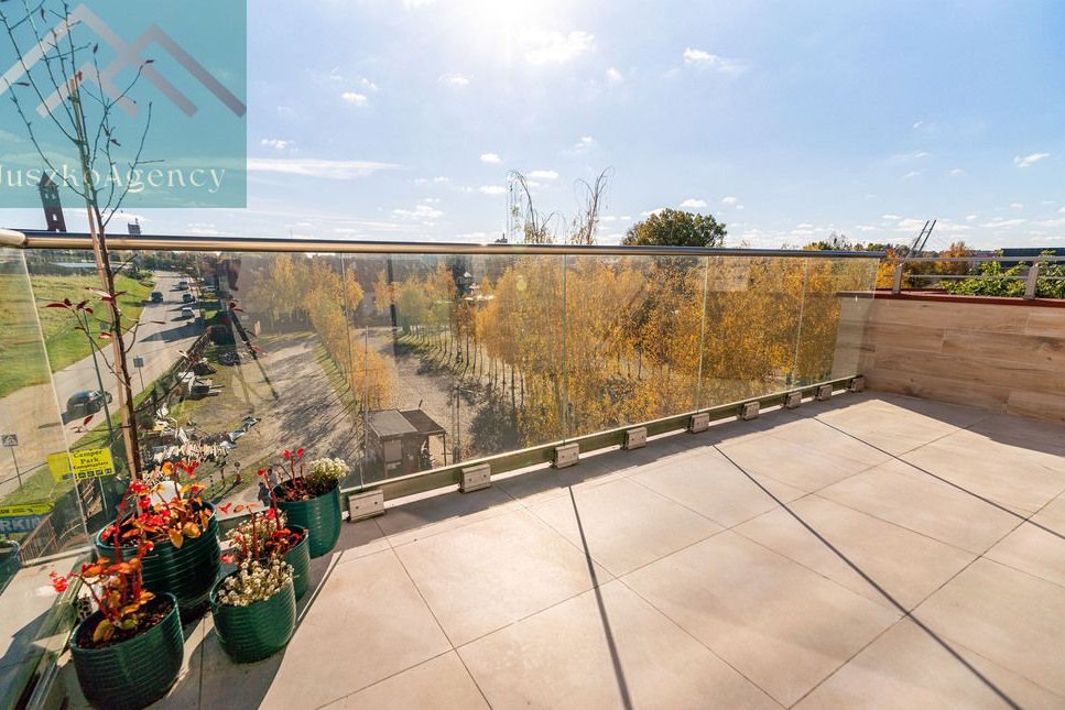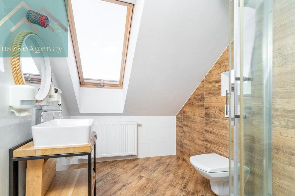 Poddasze zostało zaadaptowane na potrzeby właścicieli – wyposażone w szafę, lodówkę oraz meble wypoczynkowe. Z pomieszczenia gospodarczego prowadzi wyjście na przestronny balkon z widokiem na okolicę.
