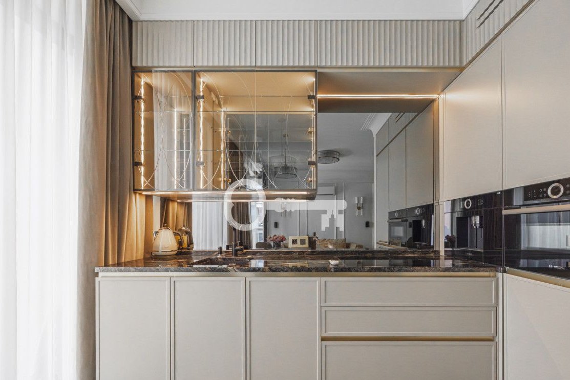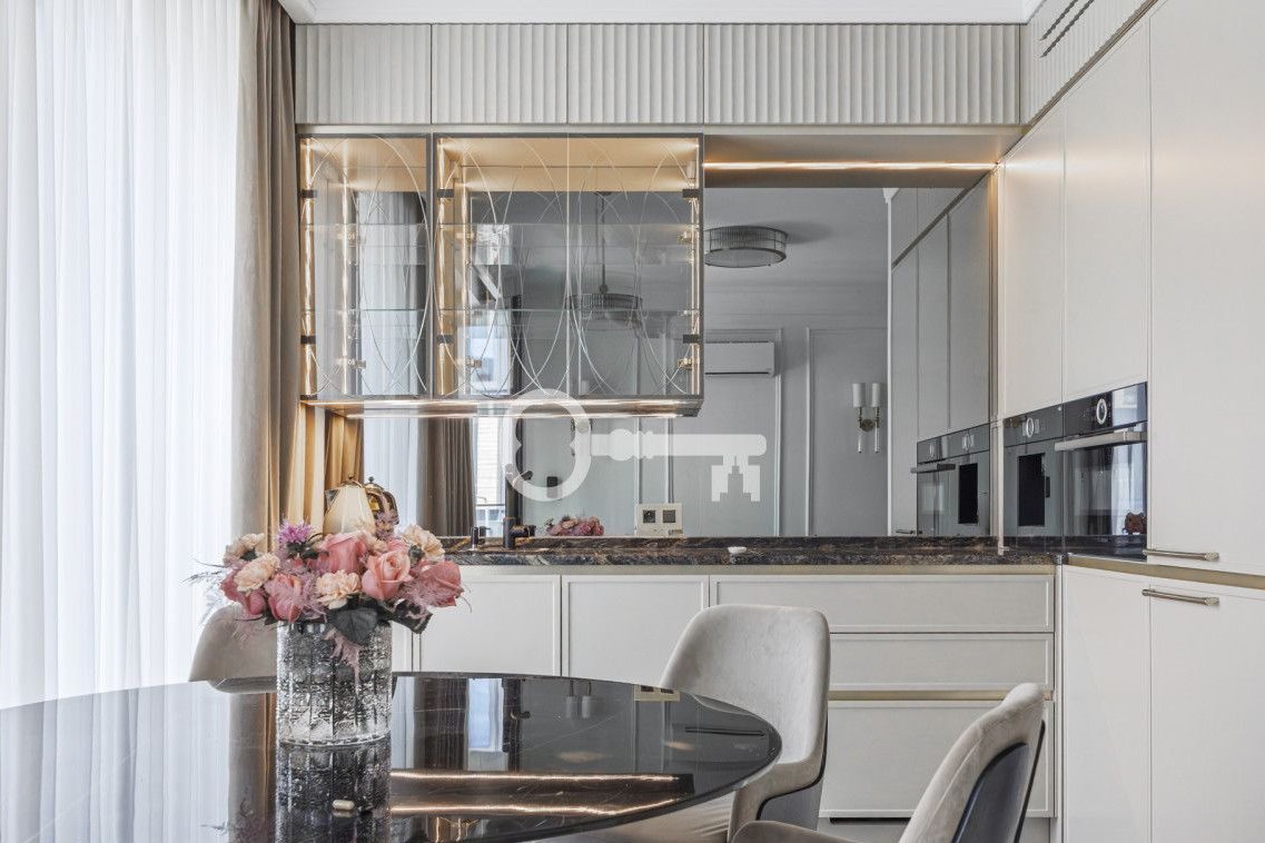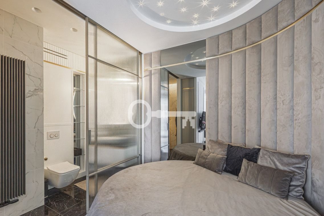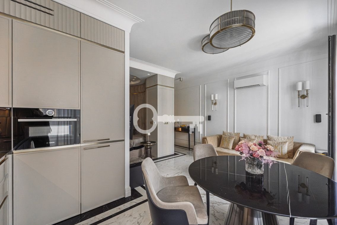 The dining area has a table for 3-4 people. The fully equipped, functional kitchen has numerous storage spaces. The floors are finished with high-quality stoneware tiles. The bedroom is in an open space with direct access to the bathroom. The apartment is equipped with a smart lighting system, air conditioning, and a Sony audio system.