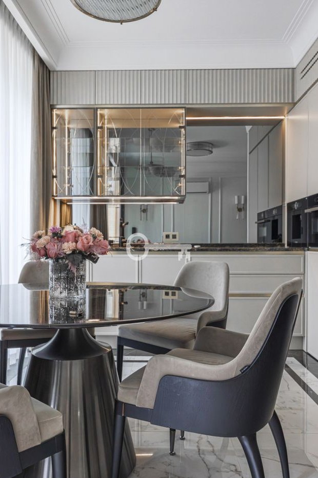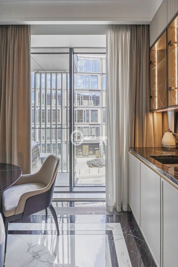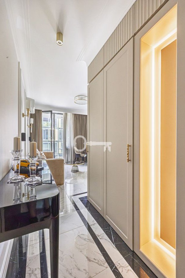 Apartament o powierzchni 36 m² wykończony przy użyciu najwyższej jakości materiałów przygotowywanych na zamówienie. Dbając o optymalne wykorzystanie przestrzeni, zaprojektowano wiele pomysłowych miejsc do przechowywania. Imponujące okno balkonowe z drzwiami zajmujące niemal całą ścianę zapewnia doskonały dostęp do naturalnego światła. Część wypoczynkowa wyposażona w kanapę, dwa stoliki kawowe i telewizor.