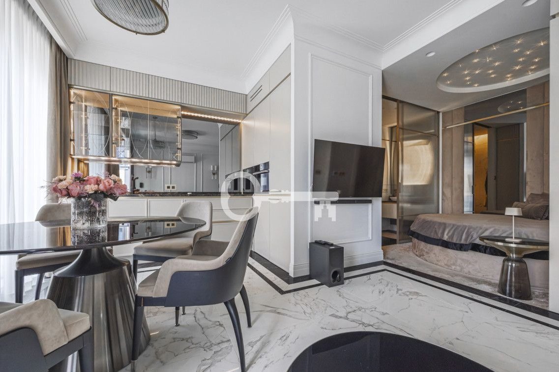 The 36 m² apartment is finished with the highest quality custom-made materials. With optimal use of space in mind, many ingenious storage spaces have been designed. An impressive balcony window with doors covering almost the entire wall provides excellent access to natural light. The seating area is equipped with a sofa, two coffee tables, and a TV.