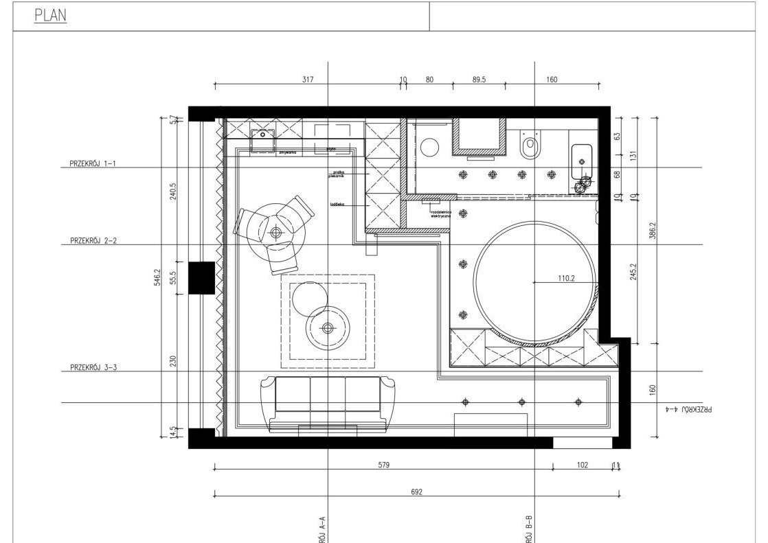 * Salon z aneksem kuchennym,