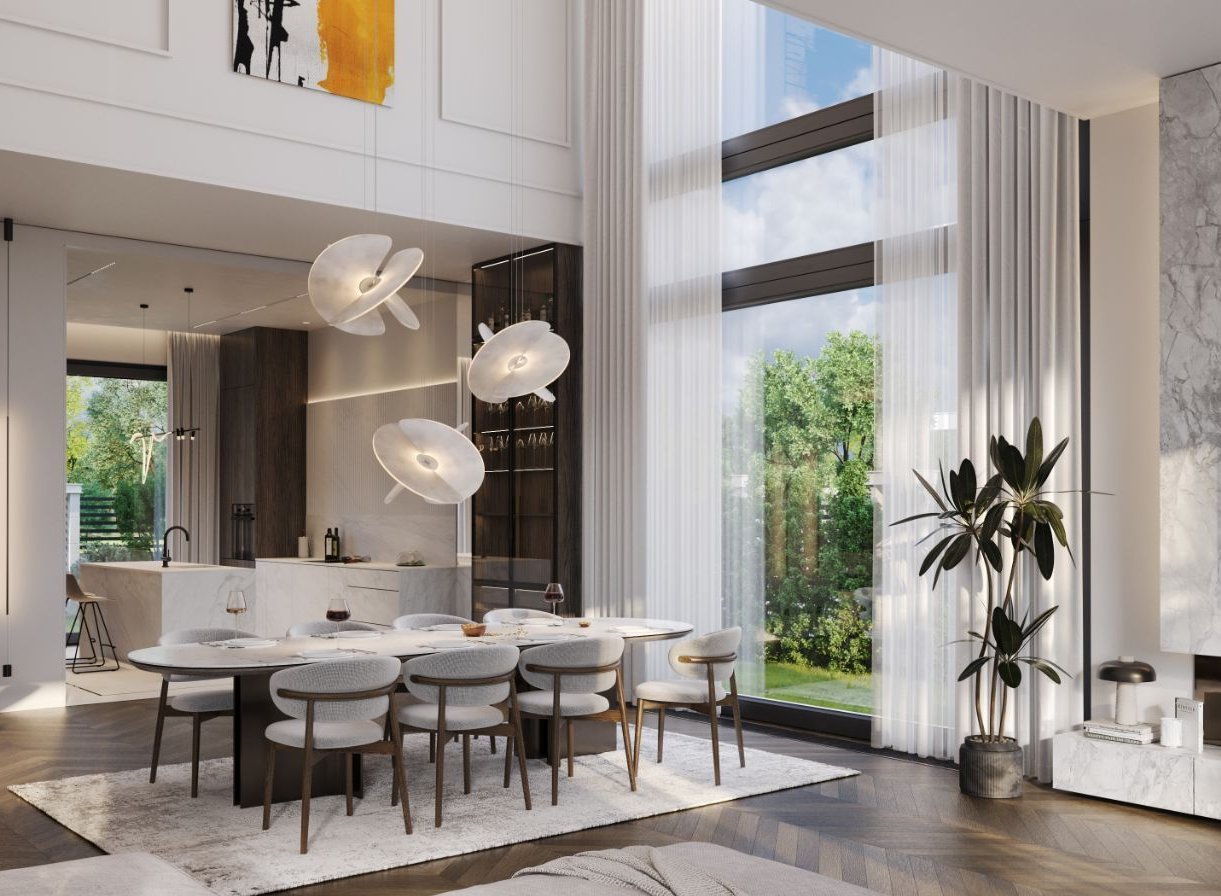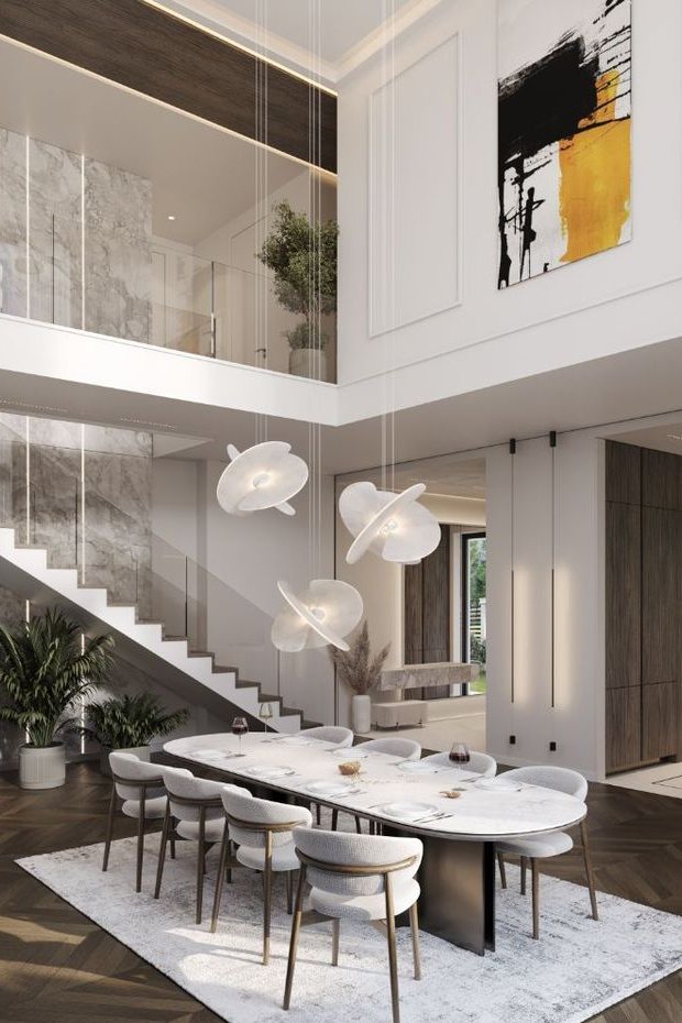 Wysokość kondygnacji na parterze to ponadprzeciętne 3,50 m, a na piętrze aż 3,0 m. W miejscu przeznaczonym na jadalnię dzięki braku stropu, sufit osiąga spektakularną wysokość 7 metrów, co w połączeniu z ogromnym przeszkleniem daje niesamowite poczucie przestrzeni, jednocześnie zapewniając znakomite doświetlenie w całym domu.