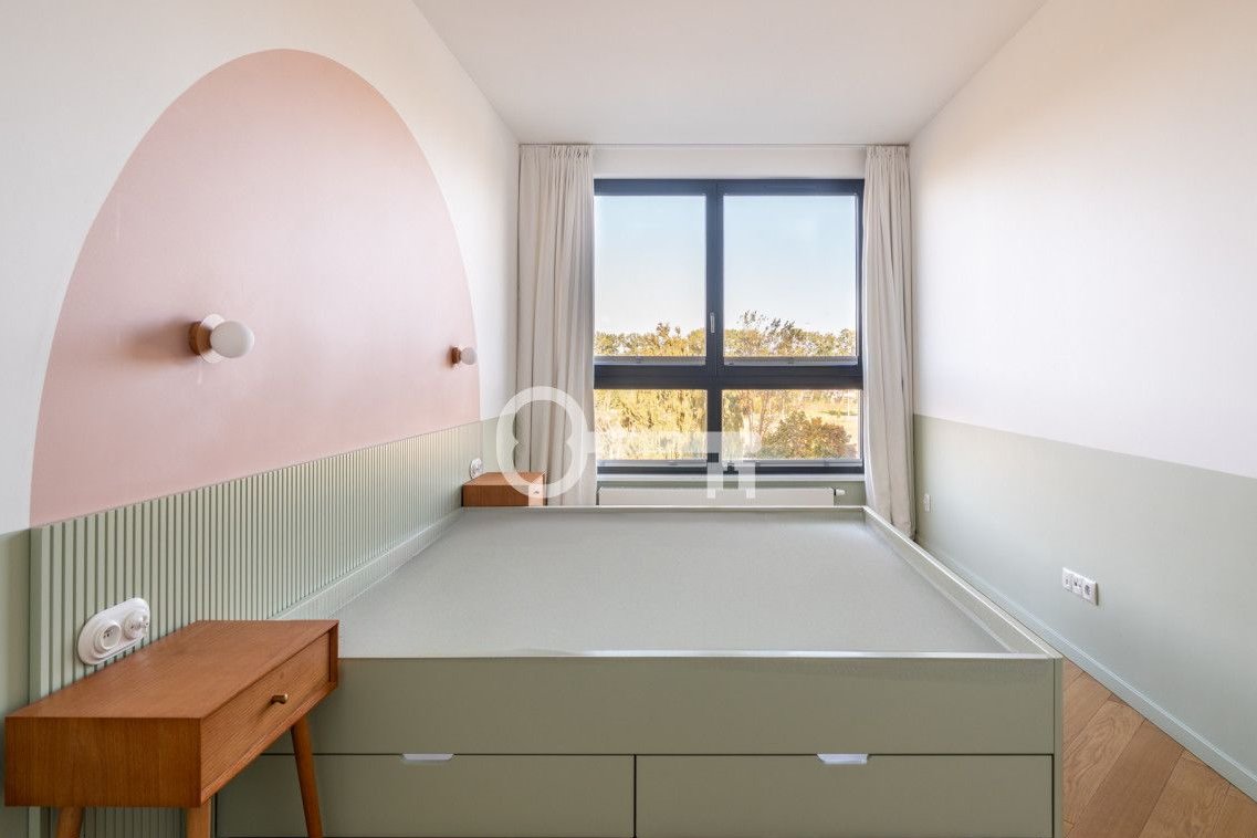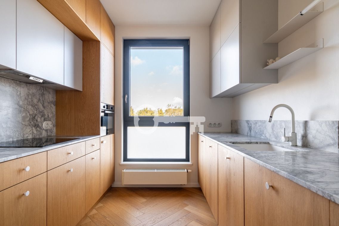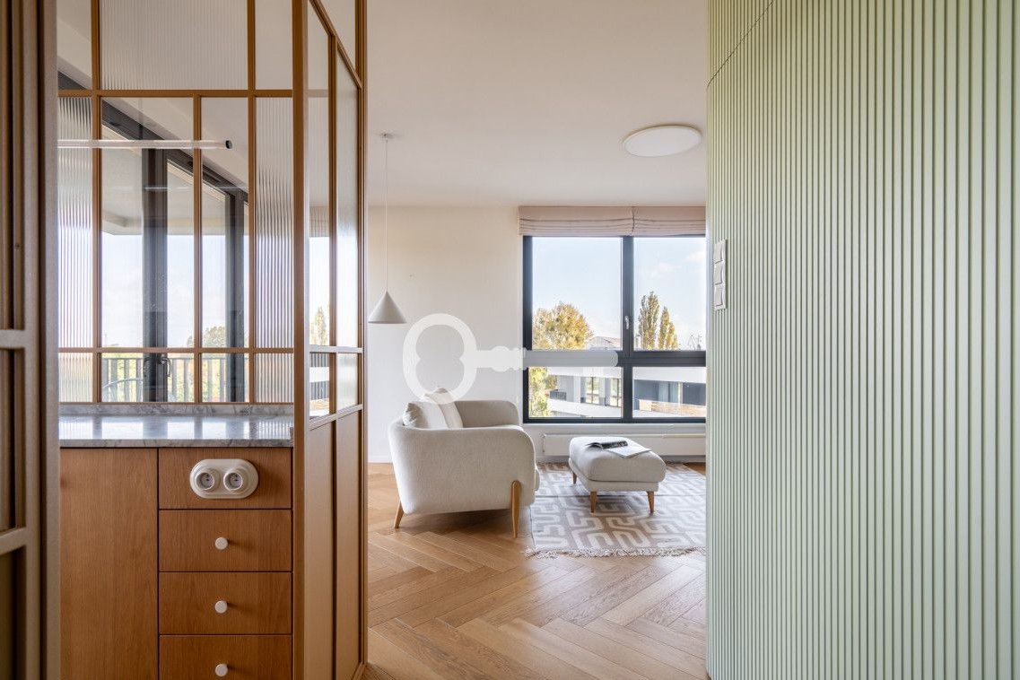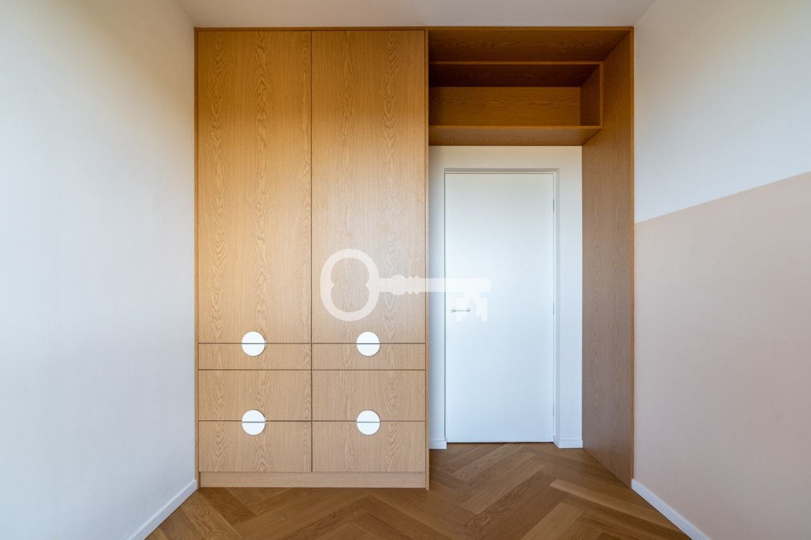 The corner apartment is lit from the west and north by large, high-quality windows. The west-facing terrace offers unique views of the sunset over the moraine hill of the Tri-City Landscape Park and allows you to observe maritime traffic in the port areas. The layout was primarily dictated by convenience and comfort - a separate kitchen, two wardrobes, two parking spaces in the garage, location on the quiet side of the building away from busy streets. The high-quality materials used to finish this apartment go hand in hand with the atmosphere of Gdynia itself and the Portova investment (veneer rounded shapes, modernist material references), while bringing in pleasant and warm colors that further enhance the comfort of living. The entire project was designed by the renowned EM2 - Interior Design studio, and its implementation has been recognized on the market, for example through a photo shoot of the premises in & Living magazine.