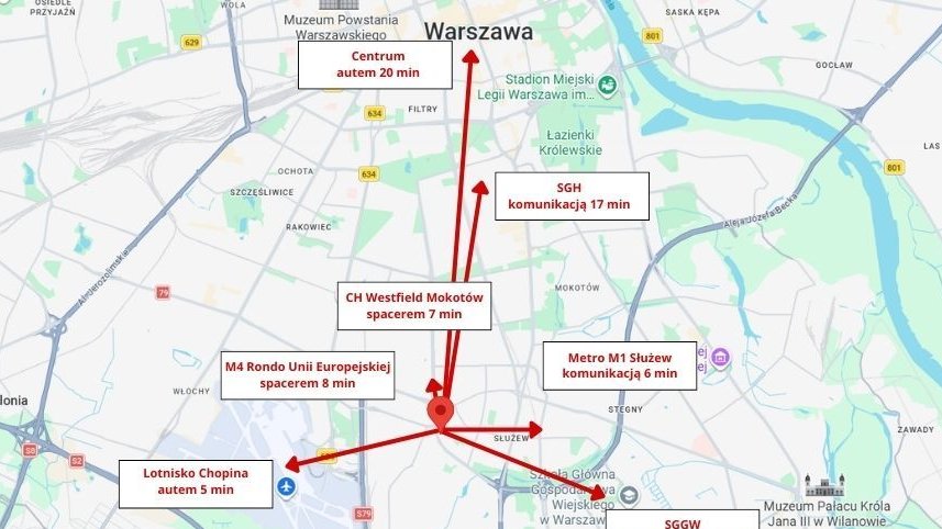 Doskonała lokalizacja na Mokotowie. Bardzo dobry dojazd do Metra M1 Służew, dworca PKP Służewiec i Lotniska Chopina. W zasięgu spaceru znajduje się CH Westfield Mokotów oraz rozległe tereny zieleni nad Potokiem Służewieckim. Szybki dojazd do uczelni: SGGW, WUM, SGH i Łazarskiego. Bardzo blisko planowana nowa stacja Metra M4 Rondo Unii Europejskiej, co zwiększa atrakcyjność inwestycji w przyszłości.